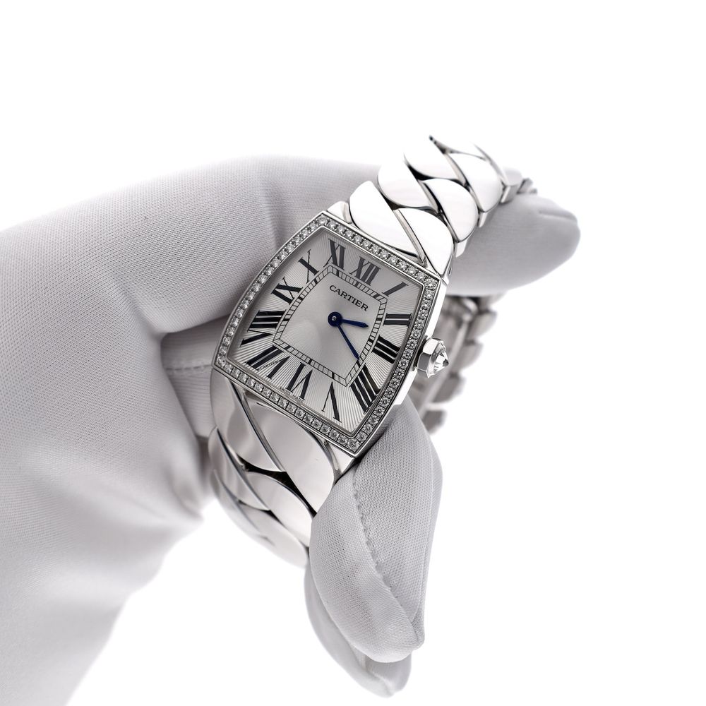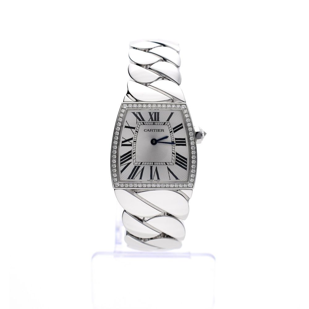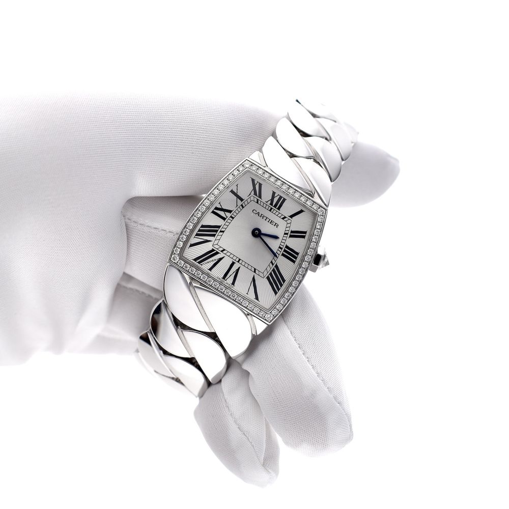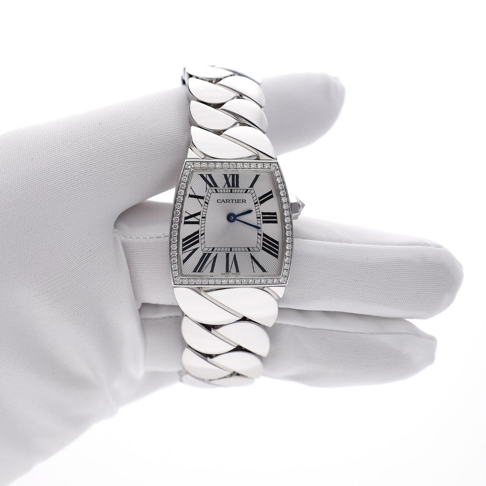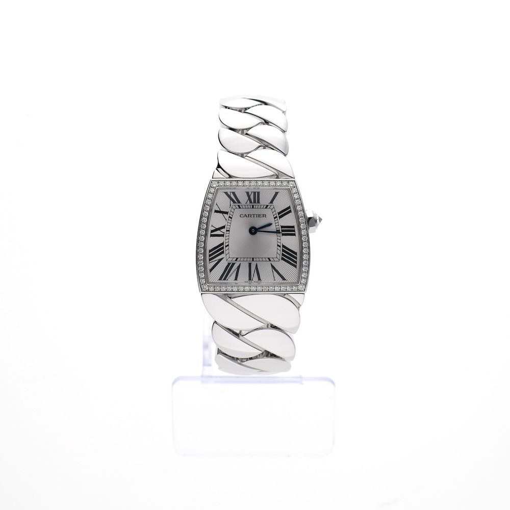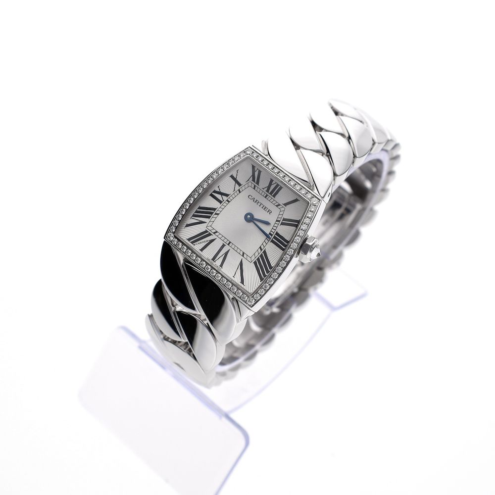 What a rare top jewel! The Cartier ‘La Dona de Cartier’ with reference number 2895 W60039G. This is a timeless statement of style and class, executed in 18k white gold and set with 0.84 ct. of top diamonds! This beautiful Cartier icon is in new condition, comes as a full set and weighs no less than 199.85 grams. Elegant, striking and unmistakably Cartier. The La Dona de Cartier is a stylish watch that exudes luxury down to the smallest detail. Inspired by the iconic Mexican film star María Félix, a woman known for her style and boldness, this watch is designed for those who dare to stand out. Model: La Dona de Cartier 2895 W60039G Case size: 28mm x 22mm Material: 18k gold. White gold Movement: Quartz, reliable and user-friendly with a new battery (08-2025) Dial: Silver/white guilloché with Roman numerals and signature blue hands Bracelet: Integrated link bracelet with folding clasp, fits wrists of up to approximately 18.5cm. Why this watch is special: Rare appearance: This model is no longer in production, and pre-owned examples in this condition are rare. Characterful design: The trapezoidal case and luxurious link bracelet make this watch a graceful statement. Fully inspected: Extensively checked for authenticity, functionality, and condition. A wonderful gift or a treat for yourself; the La Dona de Cartier is not a watch that keeps still. It is a symbol of confidence, style, and timeless class. Perfect as a luxury gift or as an investment in a pre-owned watch that will retain its value. This watch is in excellent condition and comes as a full set from 2006. Internally, we see a high-quality Swiss-Made quartz movement. The movement runs perfectly and has been fitted with a new battery (08-2025). This watch comes on the integrated steel Cartier 18k white gold bracelet with a folding clasp and all links in the bracelet fit wrists up to approximately 18.5cm. The bracelet is also in very good condition, as is the watch. This watch comes with: a luxury Cartier box, a Cartier manual/folding case/warranty papers, a report/delivery appraisal (Aalbers in Velp), and an in-house warranty report with a 1-year warranty.
