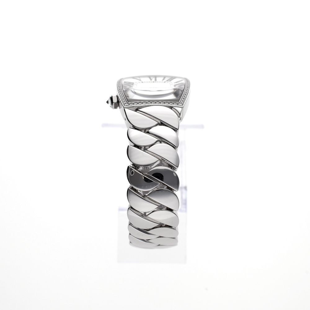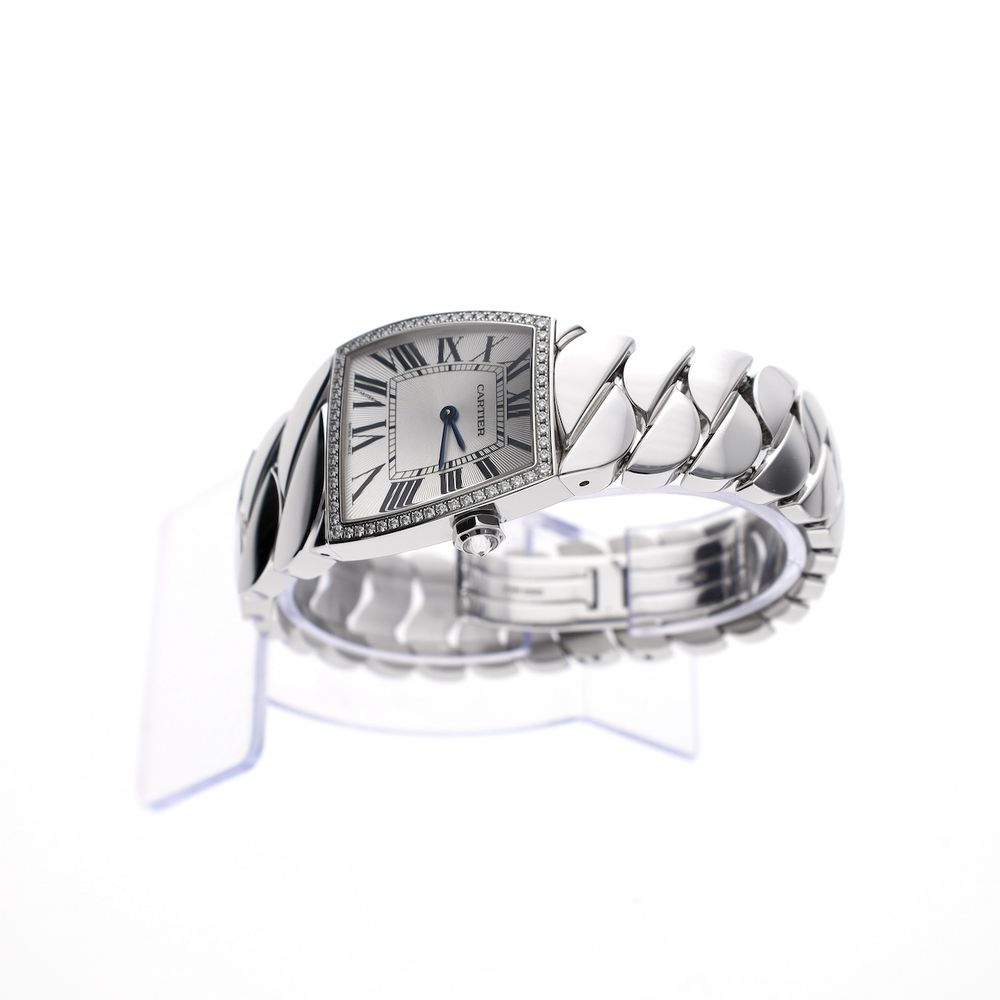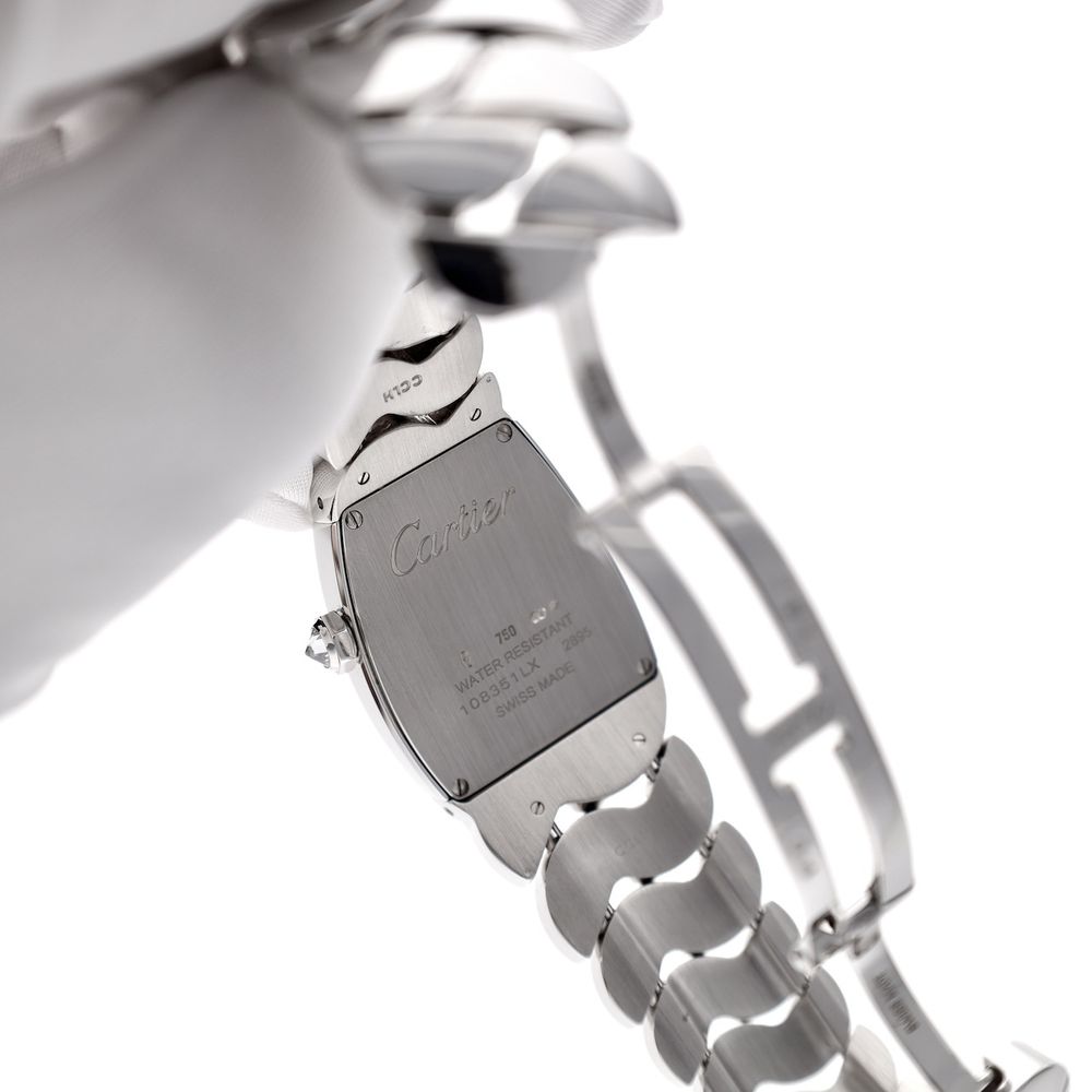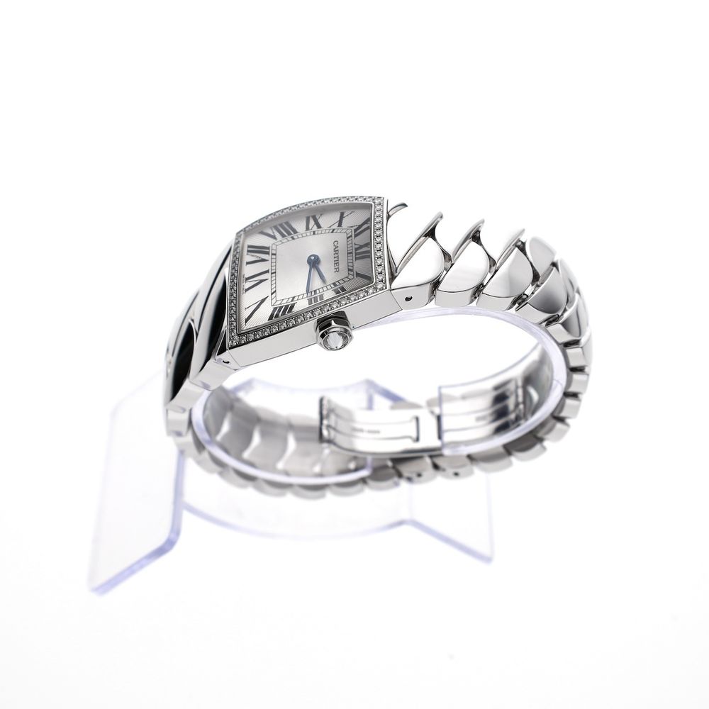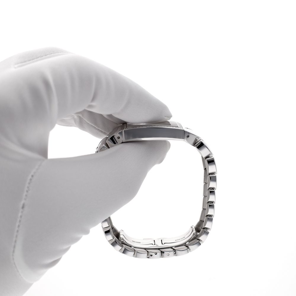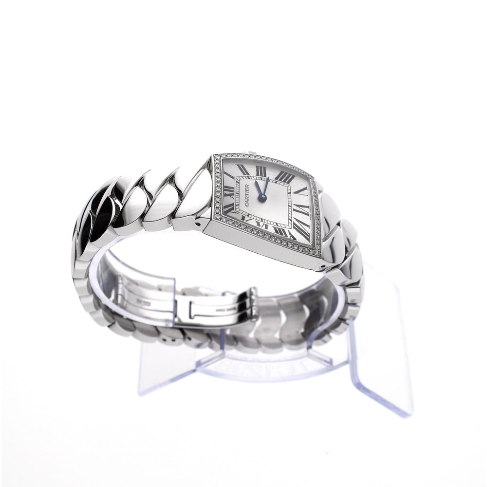 What a rare top jewel! The Cartier ‘La Dona de Cartier’ with reference number 2895 W60039G. This is a timeless statement of style and class, executed in 18k white gold and set with 0.84 ct. of top diamonds! This beautiful Cartier icon is in new condition, comes as a full set and weighs no less than 199.85 grams. Elegant, striking and unmistakably Cartier. The La Dona de Cartier is a stylish watch that exudes luxury down to the smallest detail. Inspired by the iconic Mexican film star María Félix, a woman known for her style and boldness, this watch is designed for those who dare to stand out. Model: La Dona de Cartier 2895 W60039G Case size: 28mm x 22mm Material: 18k gold. White gold Movement: Quartz, reliable and user-friendly with a new battery (08-2025) Dial: Silver/white guilloché with Roman numerals and signature blue hands Bracelet: Integrated link bracelet with folding clasp, fits wrists of up to approximately 18.5cm. Why this watch is special: Rare appearance: This model is no longer in production, and pre-owned examples in this condition are rare. Characterful design: The trapezoidal case and luxurious link bracelet make this watch a graceful statement. Fully inspected: Extensively checked for authenticity, functionality, and condition. A wonderful gift or a treat for yourself; the La Dona de Cartier is not a watch that keeps still. It is a symbol of confidence, style, and timeless class. Perfect as a luxury gift or as an investment in a pre-owned watch that will retain its value. This watch is in excellent condition and comes as a full set from 2006. Internally, we see a high-quality Swiss-Made quartz movement. The movement runs perfectly and has been fitted with a new battery (08-2025). This watch comes on the integrated steel Cartier 18k white gold bracelet with a folding clasp and all links in the bracelet fit wrists up to approximately 18.5cm. The bracelet is also in very good condition, as is the watch. This watch comes with: a luxury Cartier box, a Cartier manual/folding case/warranty papers, a report/delivery appraisal (Aalbers in Velp), and an in-house warranty report with a 1-year warranty.