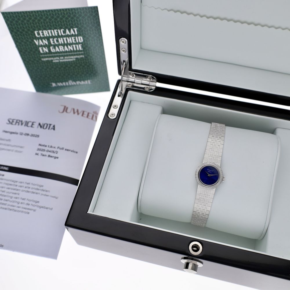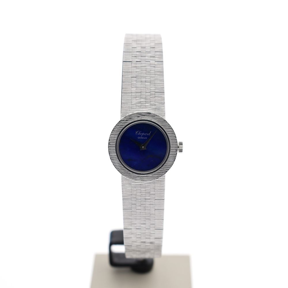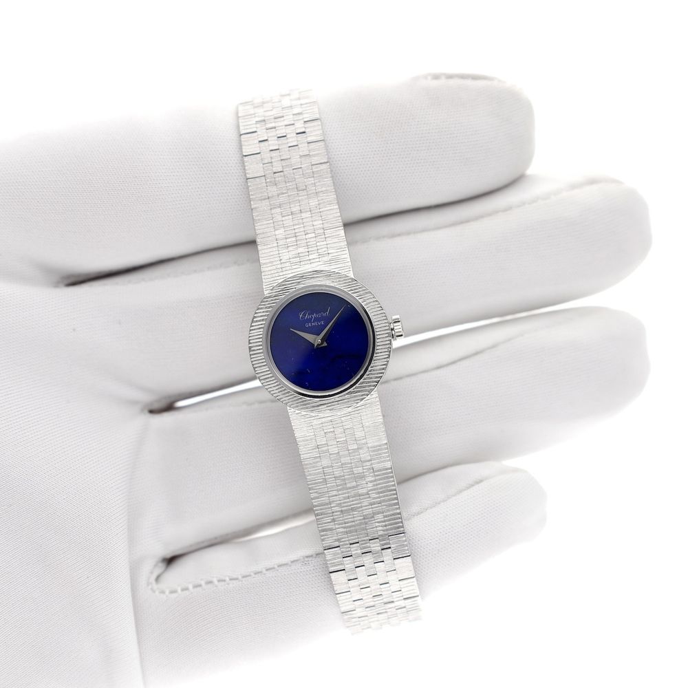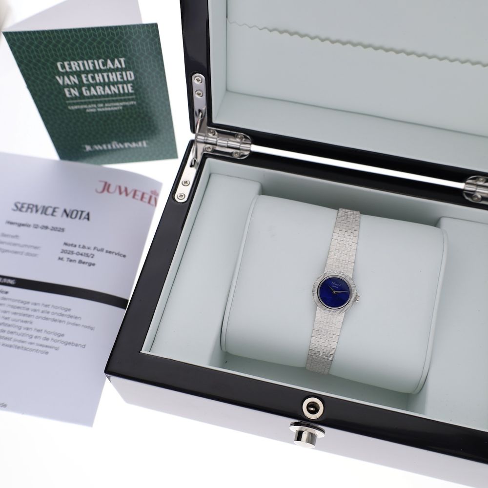 What a stunning jewel! This unique Chopard Geneva Cocktail watch is an exceptional women's watch that combines elegance and exclusivity. Crafted from 18k white gold, this vintage gem exudes timeless class. The rare Lapis Lazuli dial gives this watch a unique, luxurious look that immediately catches the eye. Chopard's refined design makes this watch a true jewel on the wrist. The deep blue sheen of the natural Lapis Lazuli creates a beautiful contrast with the gleaming white gold. Subtle, stylish, yet striking, it's ideal as an evening watch or as a refined accent to an elegant outfit. With a charming 20mm diameter, this is a very pleasant and classic watch from this high-end Swiss jewelry house with beautiful details, top-notch craftsmanship, and superb finishing. Timeless, chic, and exclusive. It is in excellent condition, and the chance of seeing a second one is virtually nonexistent. This watch weighs over 40 grams and is approximately 18cm long. Chopard is one of the world's leading haute couture & watchmakers from Switzerland. Absolutely top-class jewelry and watches in the highest segment with very high new prices. This watch features a high-quality Swiss-made mechanical/manually wound Chopard movement, which was serviced and calibrated in 2025 for accurate timekeeping. It runs perfectly and accurately. The integrated 18k white gold Chopard bracelet is of exceptionally high quality. Everything about this watch shows that it has rarely been worn. The bracelet fits wrists up to approximately 16-17.5 cm. We can resize the bracelet to your preference and deliver it to your specifications. This watch comes with our in-house box and warranty report with a 1-year warranty.