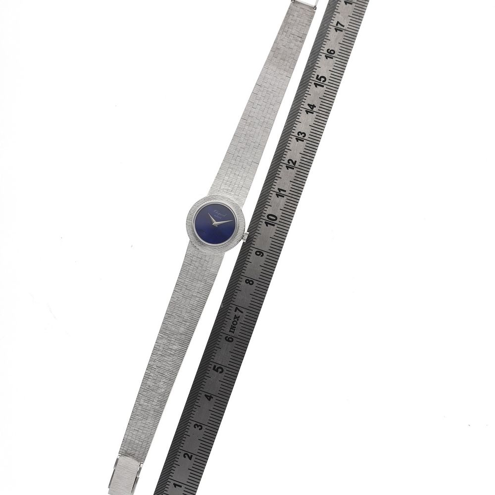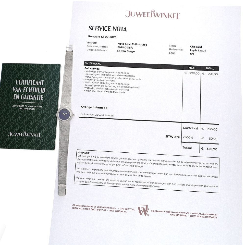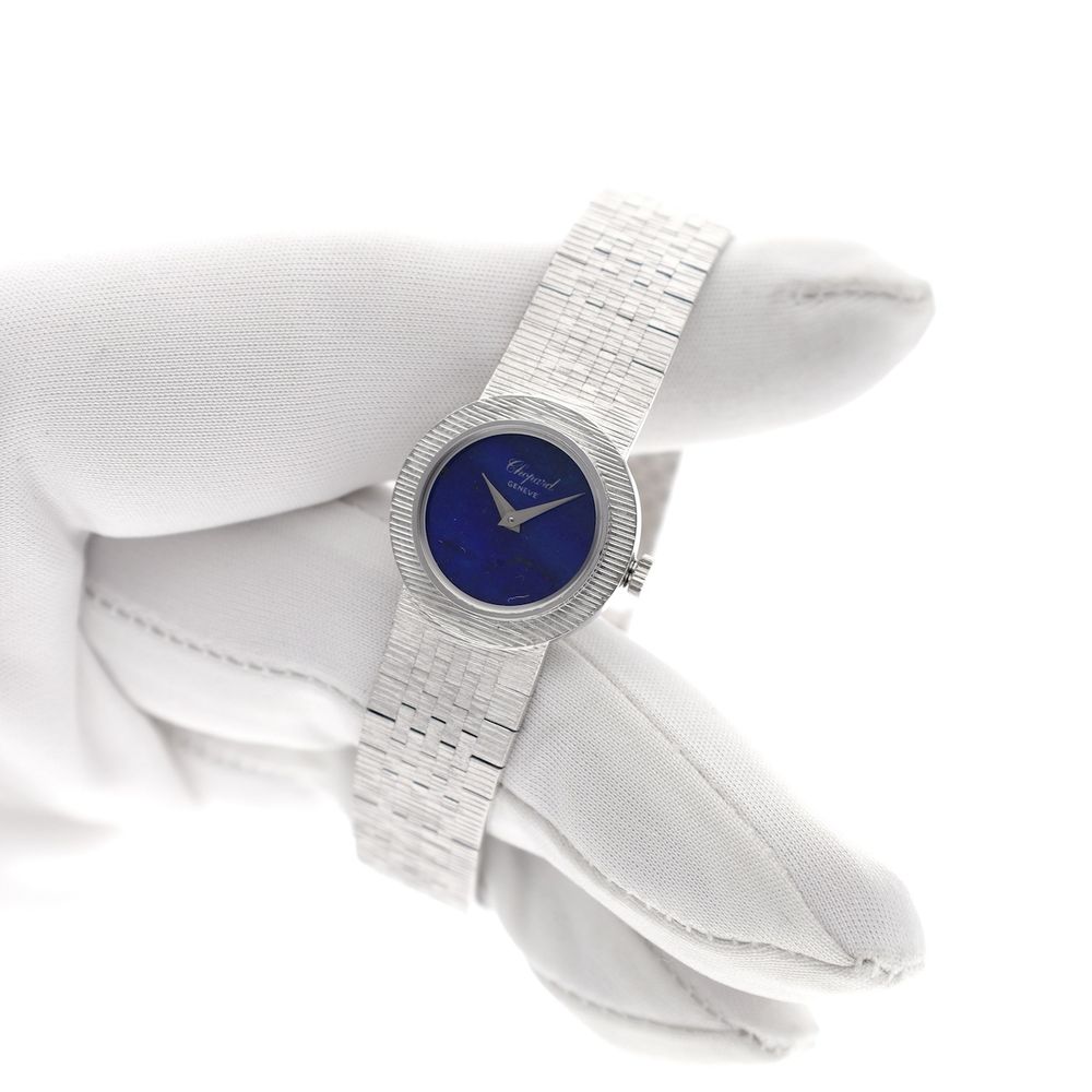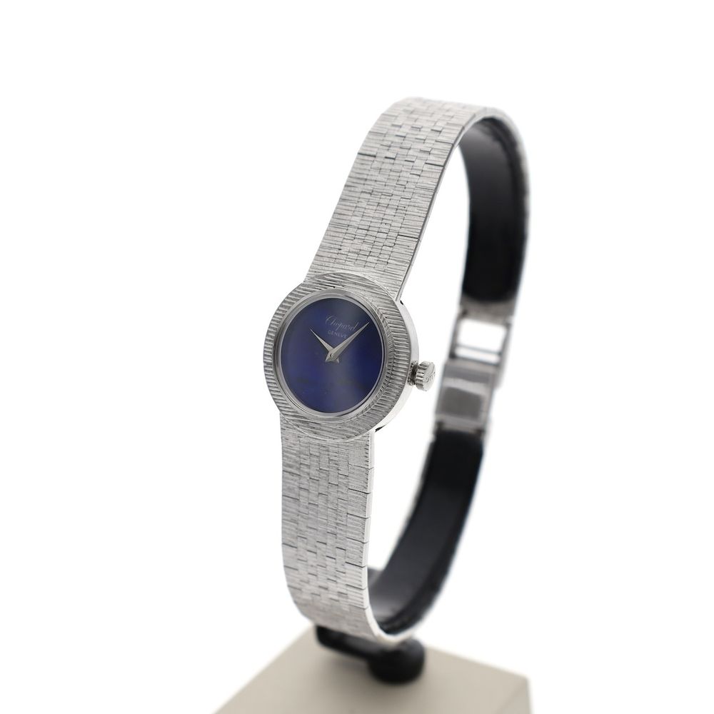 What a stunning jewel! This unique Chopard Geneva Cocktail watch is an exceptional women's watch that combines elegance and exclusivity. Crafted from 18k white gold, this vintage gem exudes timeless class. The rare Lapis Lazuli dial gives this watch a unique, luxurious look that immediately catches the eye. Chopard's refined design makes this watch a true jewel on the wrist. The deep blue sheen of the natural Lapis Lazuli creates a beautiful contrast with the gleaming white gold. Subtle, stylish, yet striking, it's ideal as an evening watch or as a refined accent to an elegant outfit. With a charming 20mm diameter, this is a very pleasant and classic watch from this high-end Swiss jewelry house with beautiful details, top-notch craftsmanship, and superb finishing. Timeless, chic, and exclusive. It is in excellent condition, and the chance of seeing a second one is virtually nonexistent. This watch weighs over 40 grams and is approximately 18cm long. Chopard is one of the world's leading haute couture & watchmakers from Switzerland. Absolutely top-class jewelry and watches in the highest segment with very high new prices. This watch features a high-quality Swiss-made mechanical/manually wound Chopard movement, which was serviced and calibrated in 2025 for accurate timekeeping. It runs perfectly and accurately. The integrated 18k white gold Chopard bracelet is of exceptionally high quality. Everything about this watch shows that it has rarely been worn. The bracelet fits wrists up to approximately 16-17.5 cm. We can resize the bracelet to your preference and deliver it to your specifications. This watch comes with our in-house box and warranty report with a 1-year warranty.