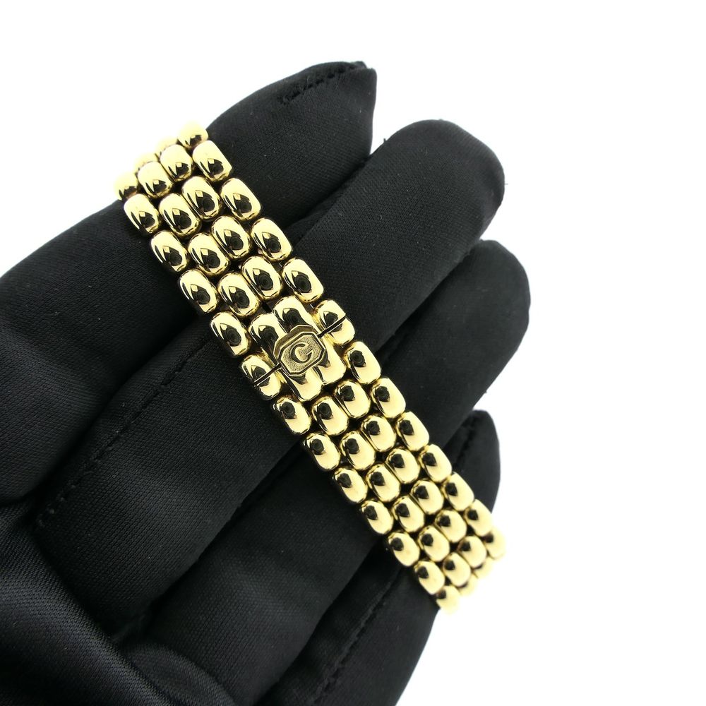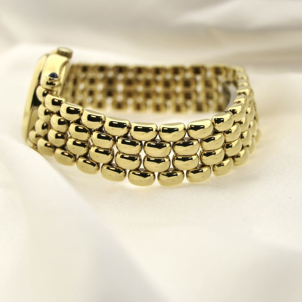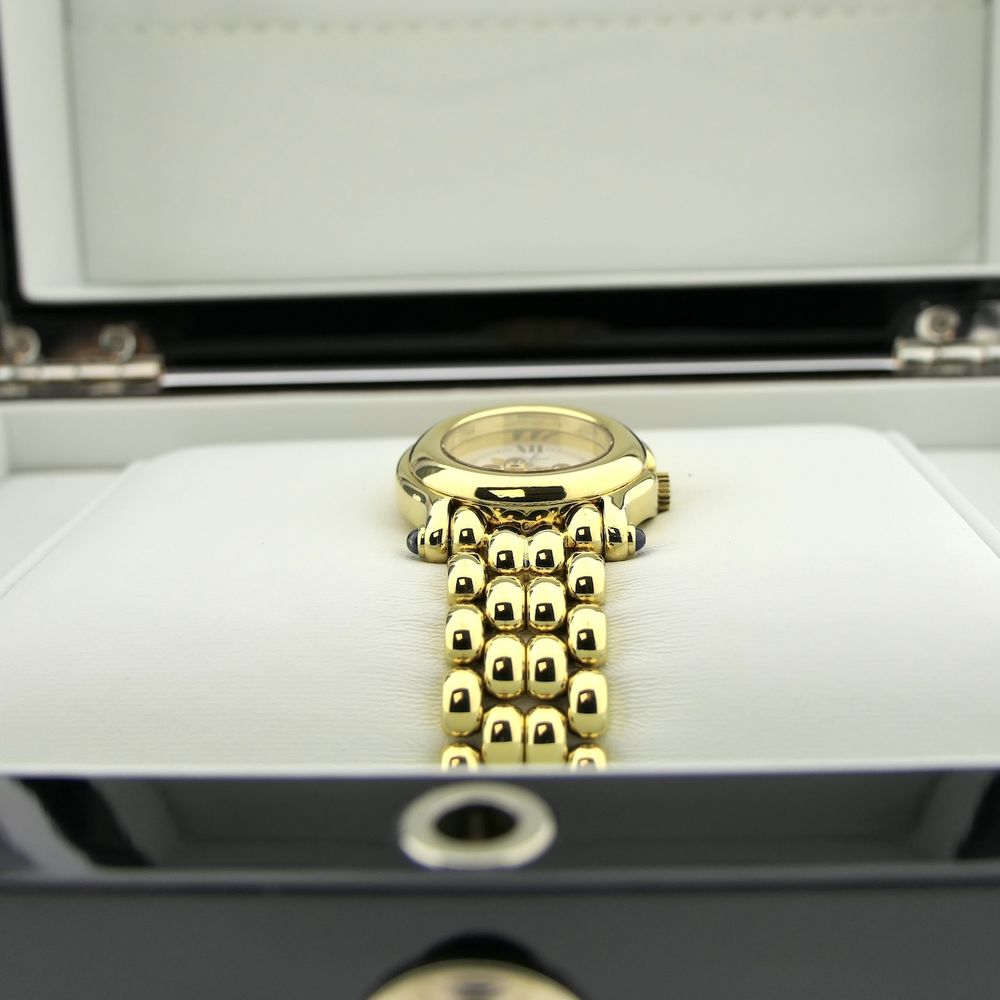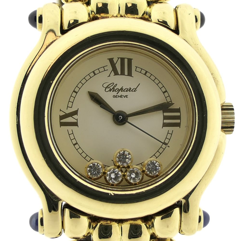 An exclusive (and remarkably heavy) 18k yellow gold Chopard Happy Sport watch for women. This watch is made entirely of 18k gold and internally set with five top diamonds that move freely between two layers of glass above the dial. A highly exclusive watch with a retail price of approximately €20,000! Absolutely timeless, chic, and dressy, it weighs over 94 grams. This watch is in excellent condition but has certainly been worn, so we are only asking a fraction of its very high retail price. Chopard is one of the world's leading haute couture & watchmakers from Switzerland. Absolutely top-class jewelry and watches in the highest segment with very high retail prices. This watch features a high-quality Swiss-made quartz movement. It runs perfectly and was fitted with a new battery in 08-2024, so it will keep the time accurately for years to come. The solid Chopard 18k gold bracelet is in good condition and features a double folding clasp. The strap fits wrists up to approximately 17cm and can be custom-made or delivered. This watch comes in a luxury in-house box and warranty report with a 1-year warranty.