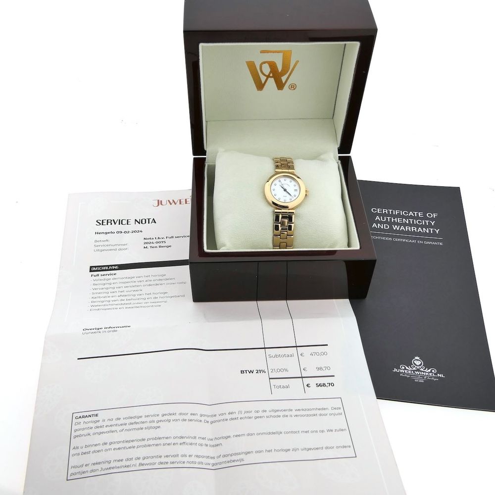 The watch is delivered in a luxurious watch box, including a warranty report, service invoice, and 1 year warranty.