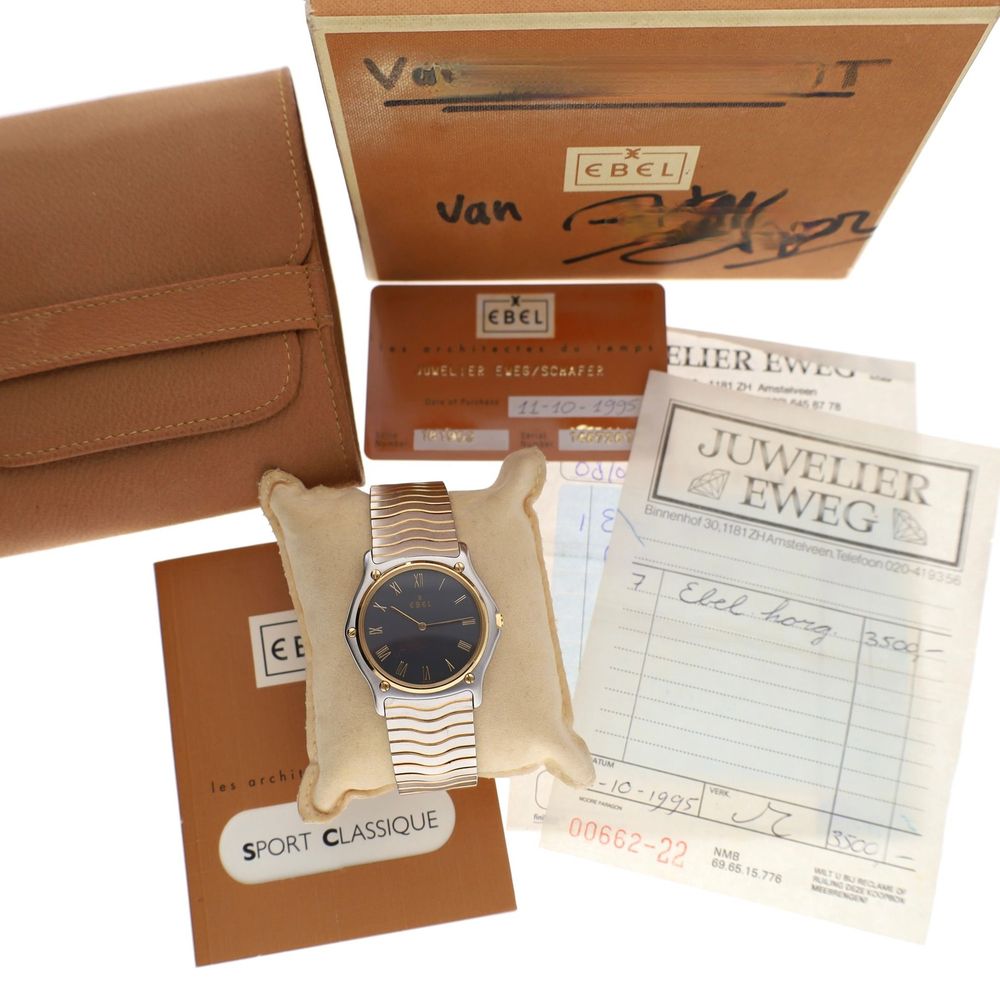 The Ebel Classic Wave (Ref. 181903) is an elegant and timeless men's watch from the recognizable Classic Wave collection of Ebel. This model is known for its refined design, featuring the signature wave-shaped bracelet and luxurious finish. This watch from 1995 had a retail price of 3500 Guilders. A significant amount in the 90s, as evidenced by the original invoice included.