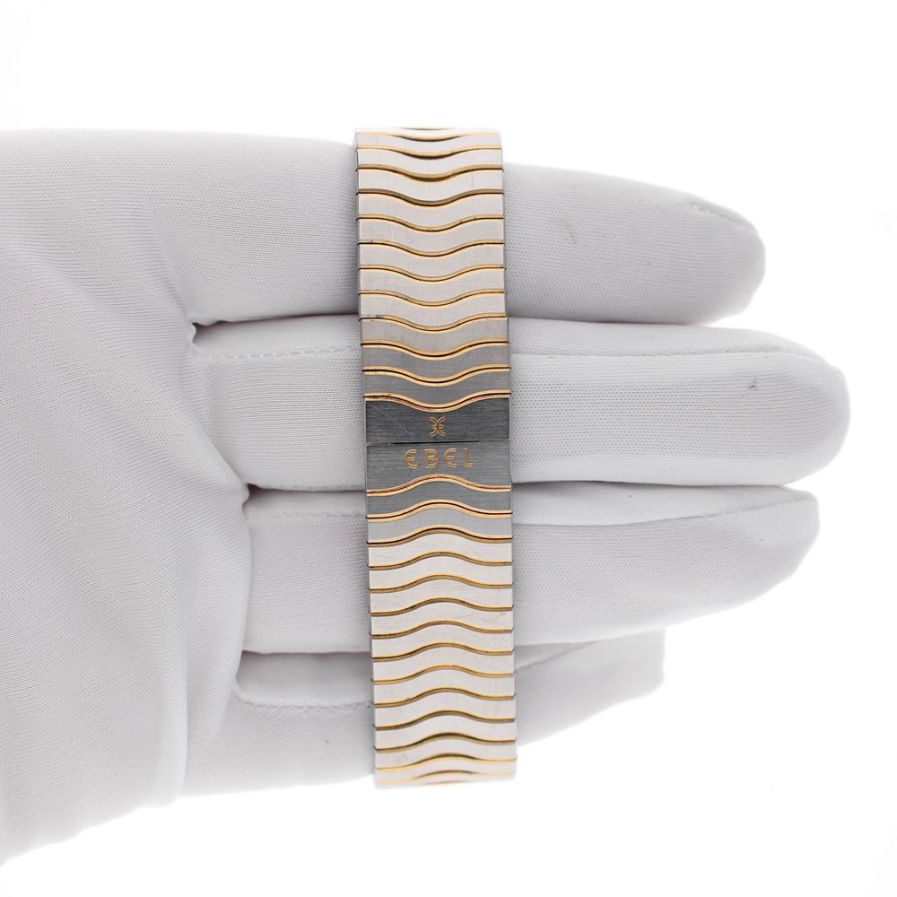 The original Ebel stainless steel bracelet with the characteristic wave structure is fitted with a hidden folding clasp, ensuring a seamless and elegant finish. The bracelet is suitable for wrists up to approximately 18.5cm. The bracelet can be adjusted to size by us.