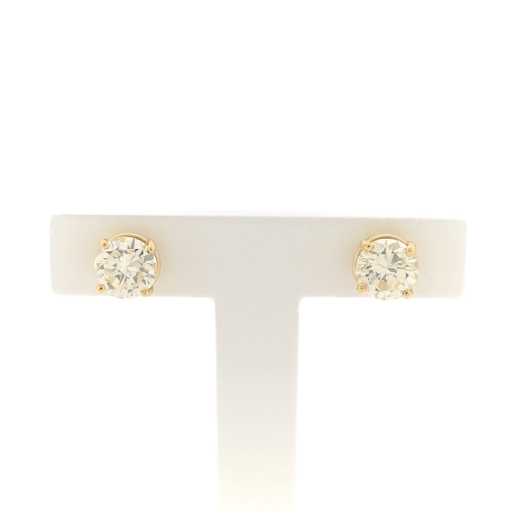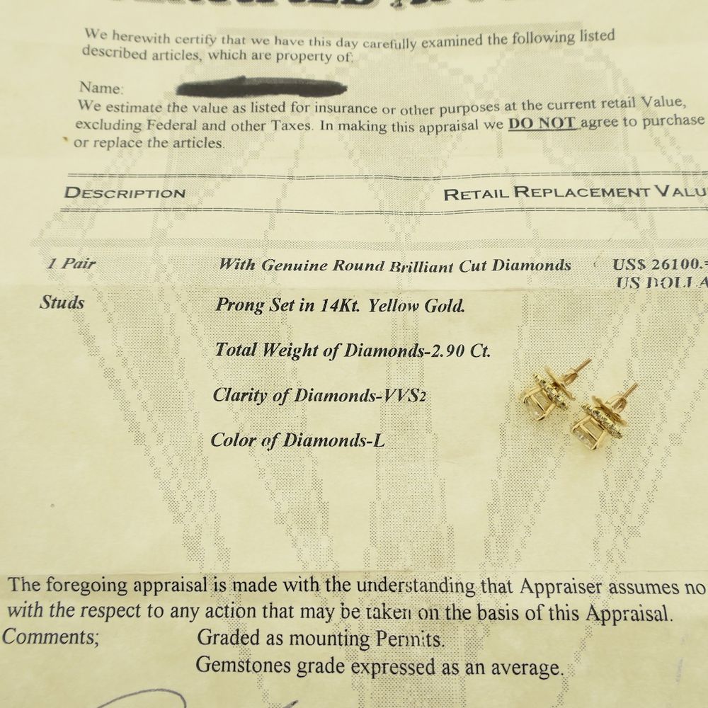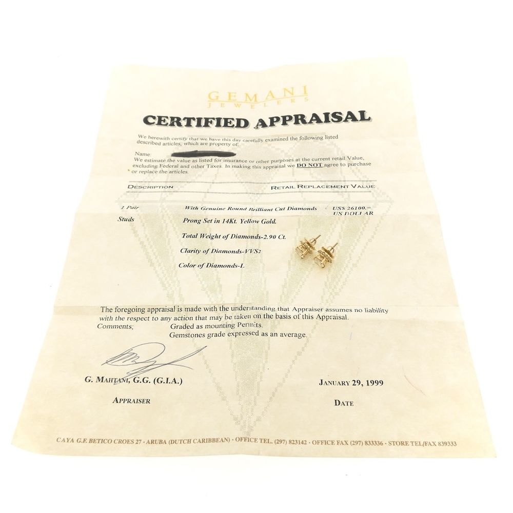 Gold stud earrings with a total of 2.90 ct. natural diamonds. The stud earrings can be worn two ways: with or without the diamond circle. The clasp screws onto the earring for extra security. The removable circles are set with a total of 28 x 0.005 ct. diamonds, while the larger diamonds weigh 1.38 ct. each. The quality of the diamonds is indicated on the VVS2 certificate with the color L. These unique, luxurious earrings are crafted from 14-karat yellow gold (585/1000).