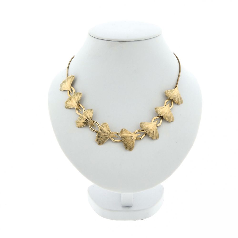 Fantasy link necklace with 8 Japanese Ginkgo leaves. The leaves are intricately engraved, making it a striking and elegant piece to wear around the neck. The length can be adjusted to 43 cm using the anchor links. The piece is made of 8-carat gold (333/1000).