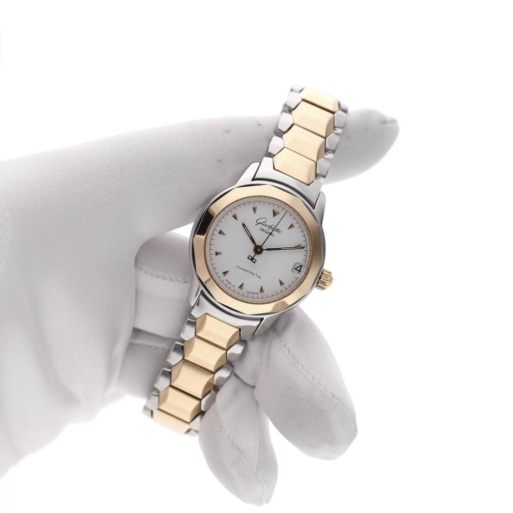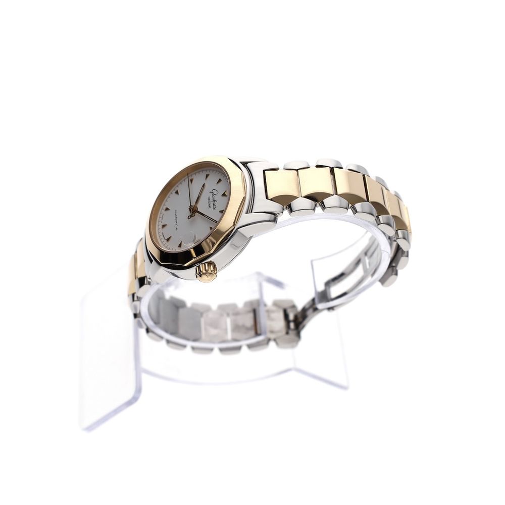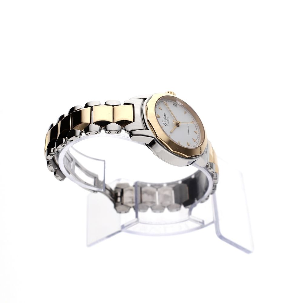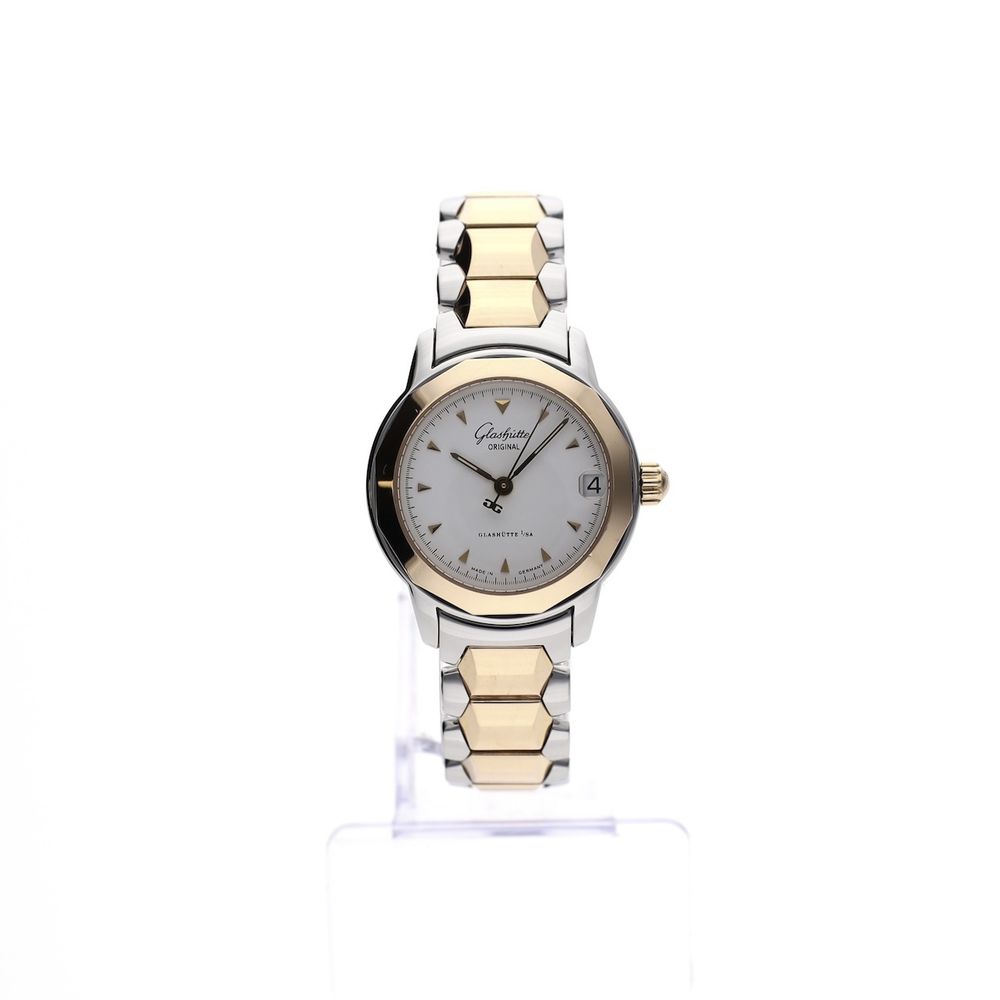 What a rarity! The Glashütte Original Sport-Lady with reference number 10-33-44-53-04. A rare automatic women's watch with a 30mm diameter. Something different from the usual women's watches, and how cool! This watch is in very good condition. Glashütte Original from the picturesque and world-famous Glashütte. This is the highest quality available from Germany, Glashütte Original. This Glashütte Sport is one of the classics of this beautiful brand. Equipped with an exceptionally high-quality manufactured automatic movement in an elegant 30mm case with a so-called 'dodecagonal' rotating bezel. Not very well known in the Netherlands among the general public, but all the more famous among collectors and enthusiasts. The Glashütte Sport-Lady 10-33-44-53-04 is a special piece of German watch history. Glashütte is known worldwide for its traditional craftsmanship and high-quality timepieces, and this sporty model combines that quality with a robust and stylish design. Inside, we find a high-quality Swiss automatic movement that runs excellently and accurately. We measure an amplitude of approximately 280 degrees and a deviation of (measured) 2 seconds per 24 hours. The original gold/steel bracelet is of exceptional quality and has a unique design reminiscent of a crocodile's back. The bracelet is solid and features a double folding clasp. The bracelet fits wrists of up to approximately 16 cm. This watch comes with a luxury in-house box and a warranty report with a 1-year guarantee. A wonderful article about the history of Glashütte can be found here.