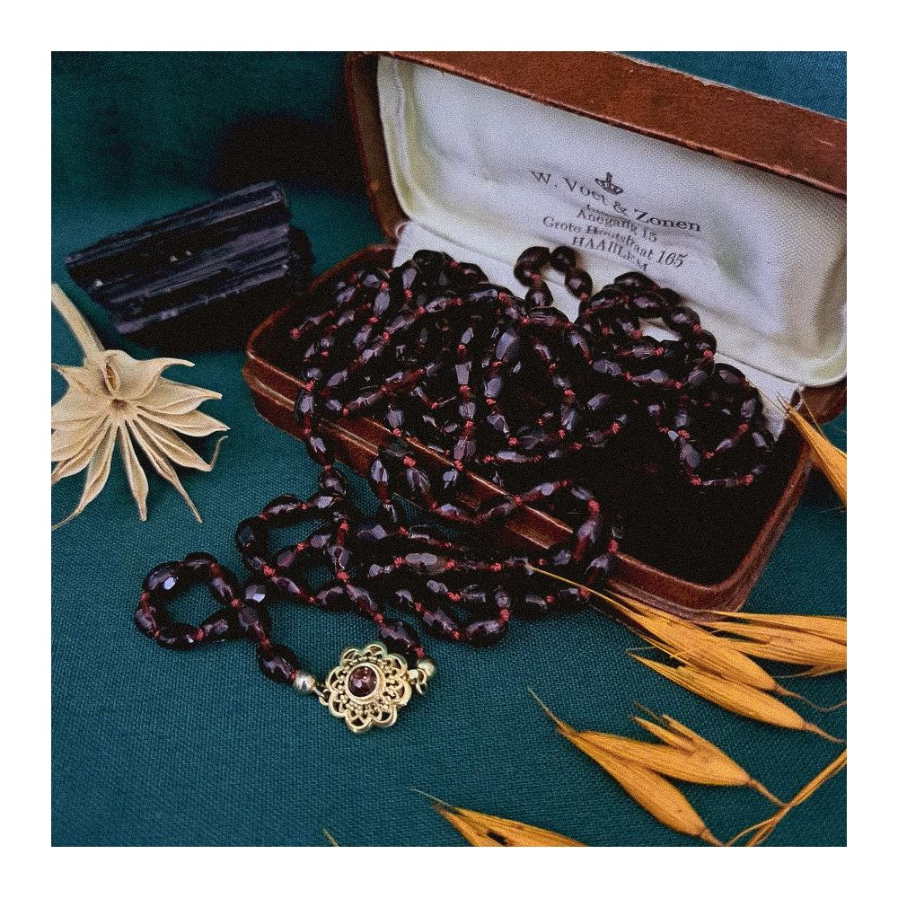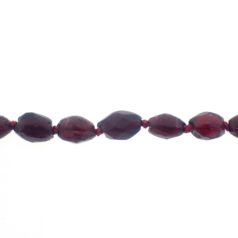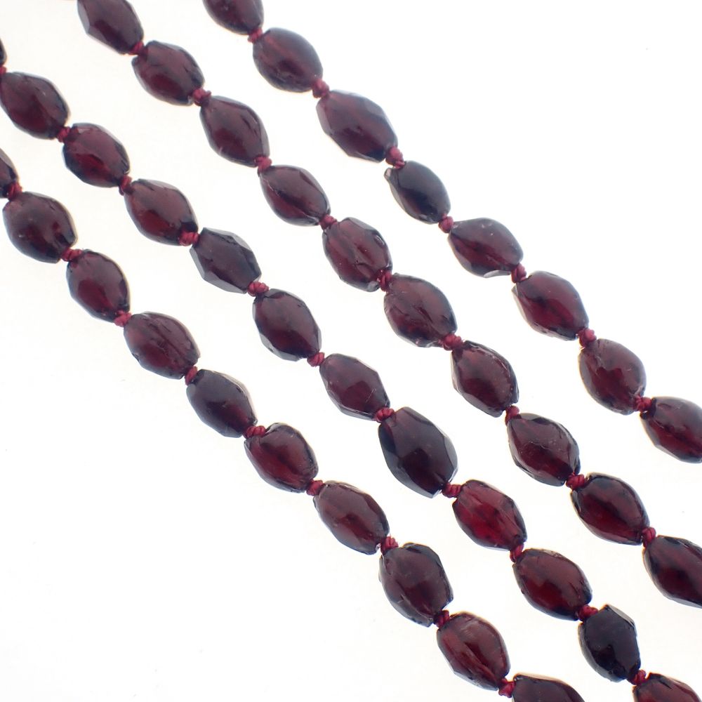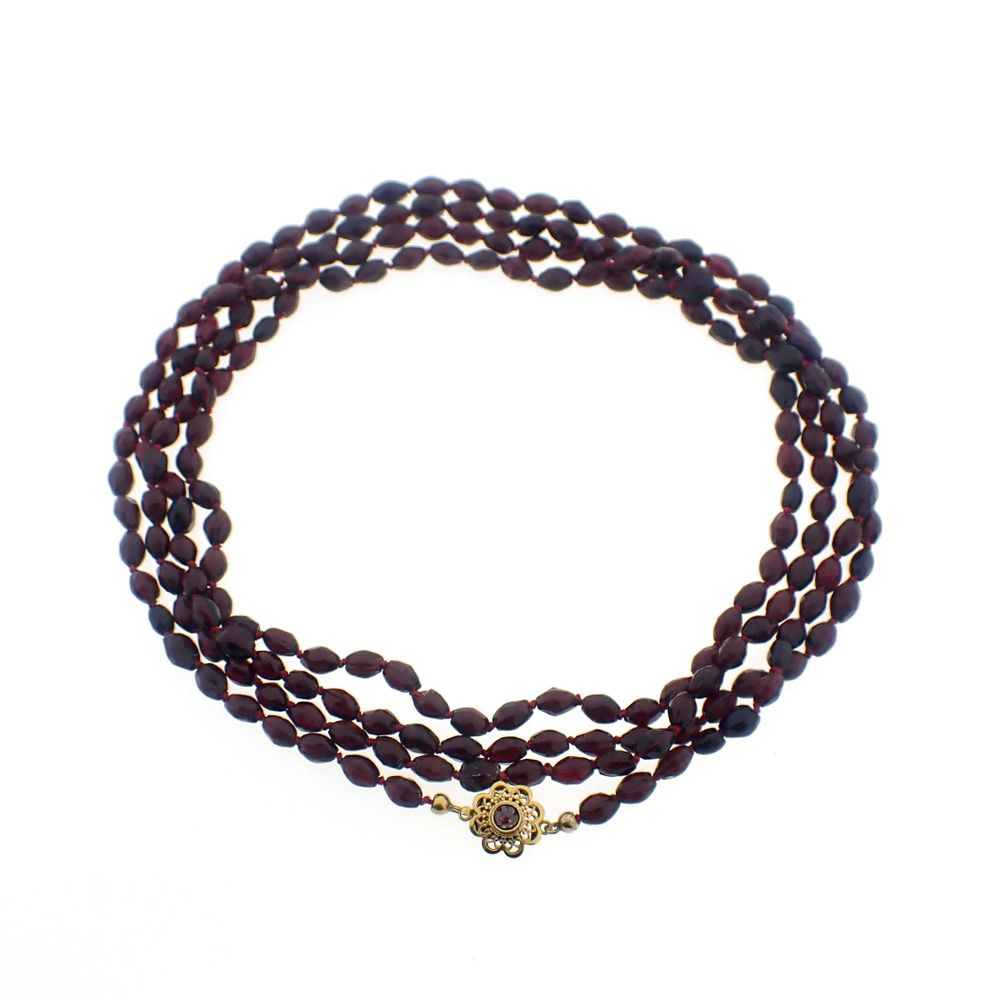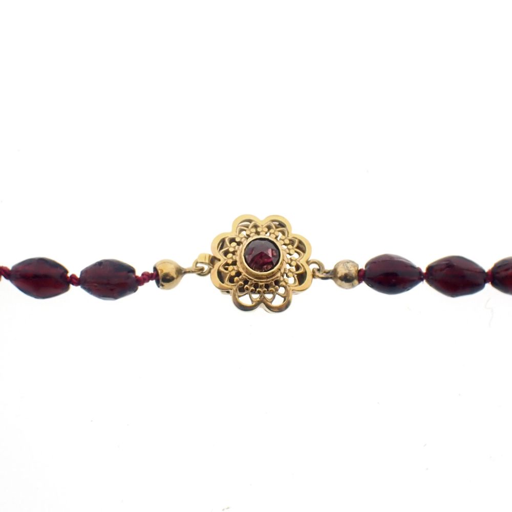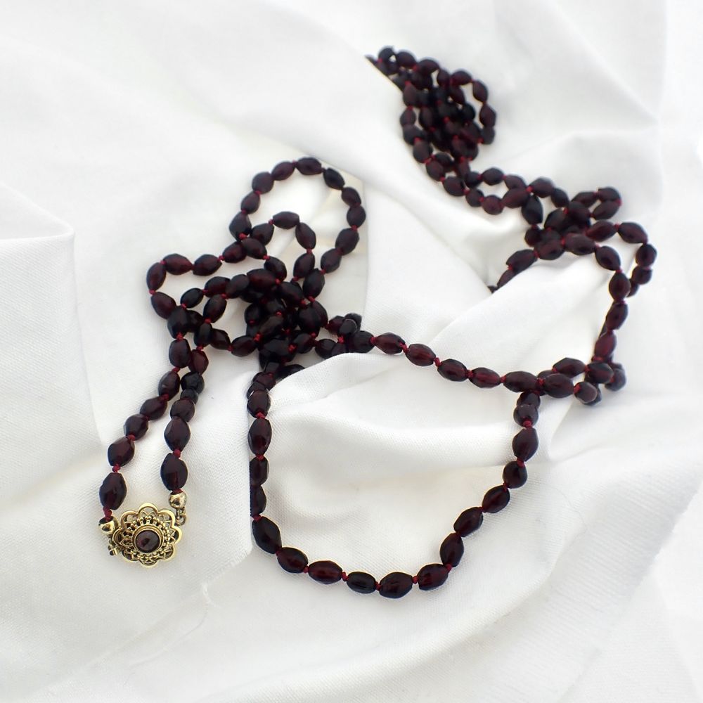 Antique/vintage necklace made of a single long strand of dark red glass beads. The beads, approximately 5.0 mm in diameter, are faceted and strung on a cord, with a knot placed between each bead. The decorative clasp is crafted from 14-karat yellow gold (585/1000). The chain is very long; formerly known as a sautoir. These long necklaces were designed to emphasize the woman's hips (through the sparkle and clink of the beads). The necklace can also be folded in half once or twice.
