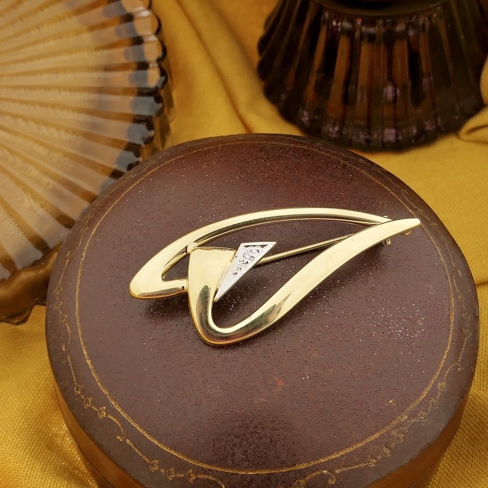 A gold brooch with dynamic lines is set with a 0.005-carat diamond, set in white gold. This beautiful piece fastens with a beret and ball hook and is crafted from 14-karat yellow gold (585/1000).