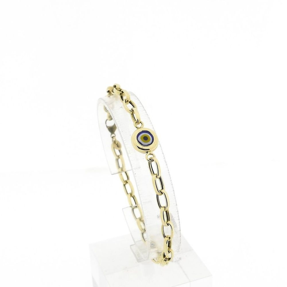 Gold anchor-link bracelet designed with the evil eye, also known as Nazar boncugu. The eye symbolizes luck and protection. The bracelet is flexible and has a smooth finish. A modern and timeless piece of jewelry suitable for both men and women. The bracelet is made of 14 karat yellow gold (585/1000).