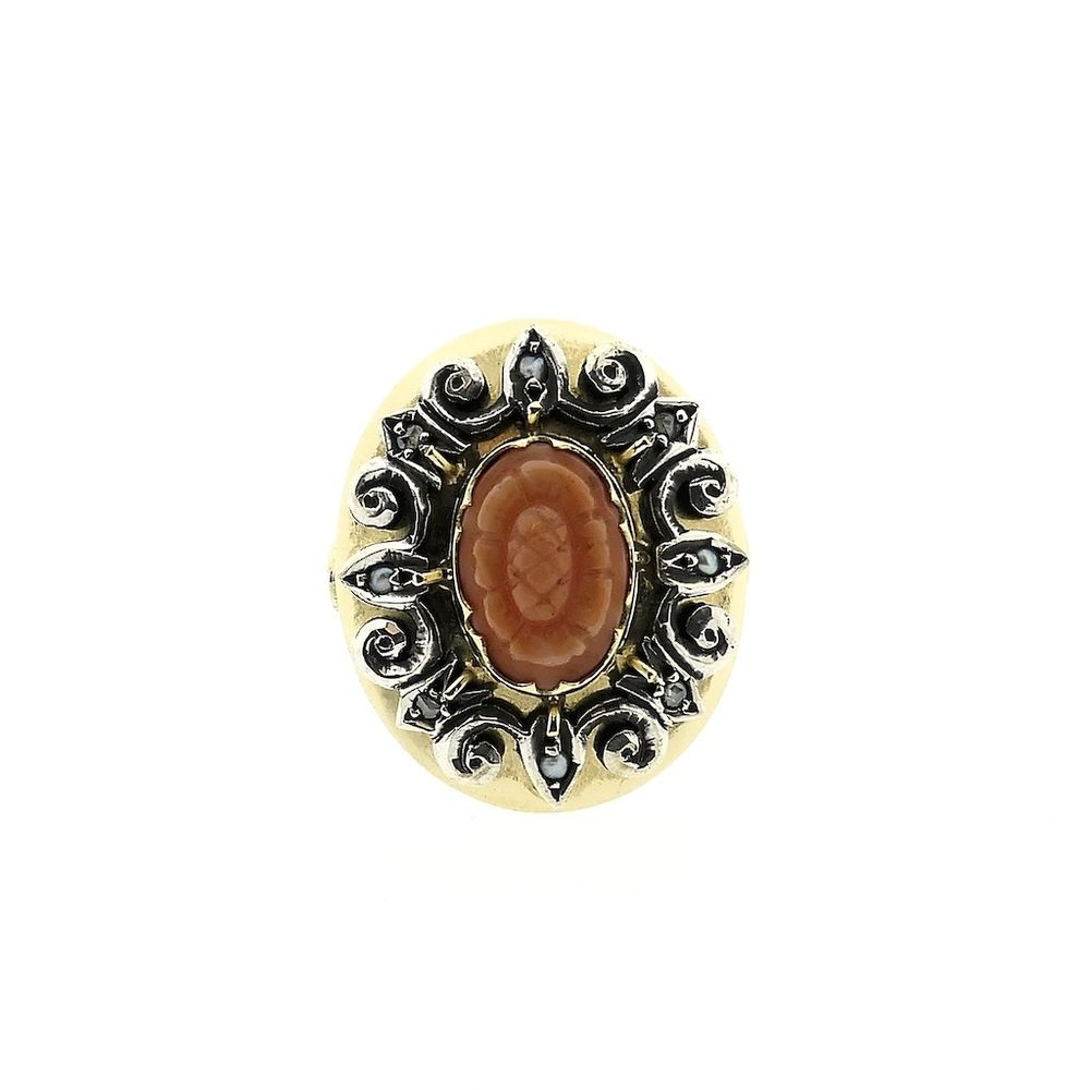 A beautiful gold ring set with a floral design of carved blood coral. The silver frame is set with a pearl and natural diamonds. Crafted from 14-karat yellow gold (585/1000) and second-grade silver (835/1000), the ring has an antique look.