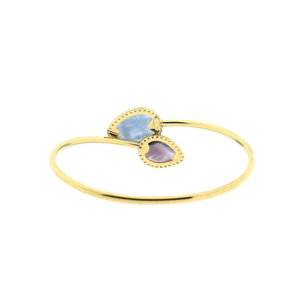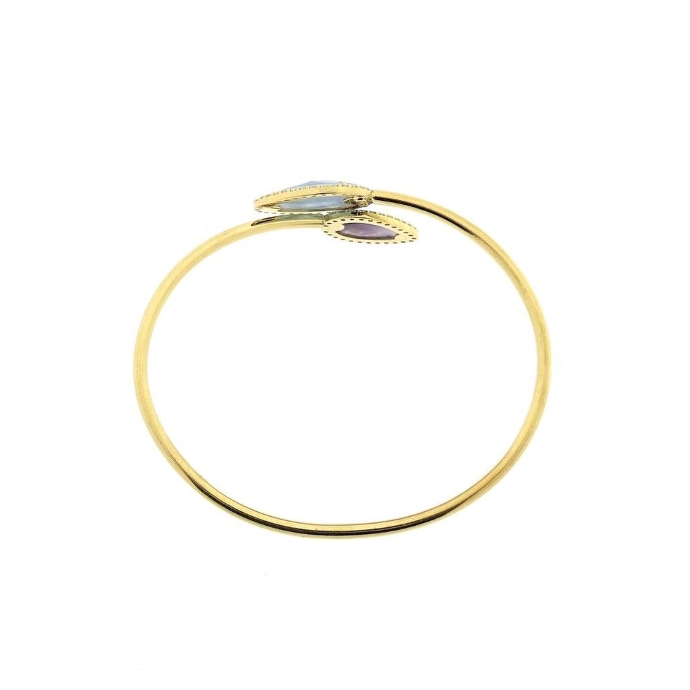 Gold bangle designed with beautiful milky chalcedony stones surrounded by sparkling cubic zirconia. The chalcedony stones are light blue and lavender-purple in color. A unique bracelet with an elegant and luxurious look. The bracelet is crafted from 18-karat yellow gold (750/1000).