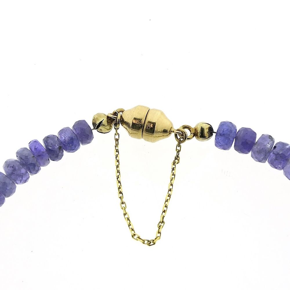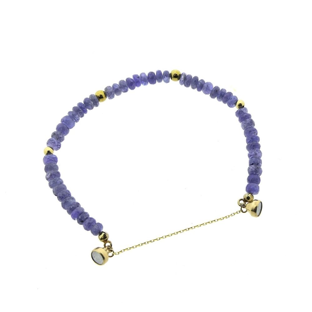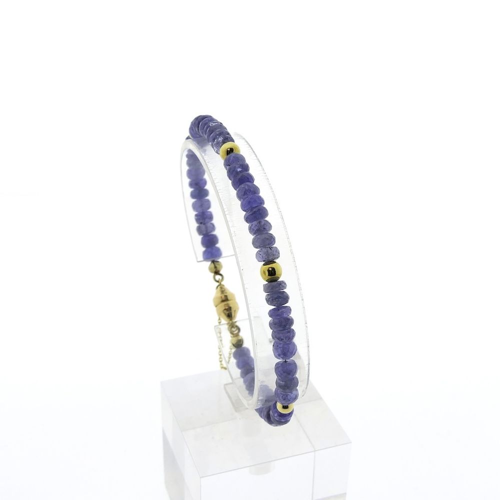 Gold beaded bracelet set with amethyst stones. The stones are roughly faceted and strung on a cord. The bracelet is further detailed with four additional 14-karat gold beads. The bracelet has a playful look and fits beautifully around the wrist. The magnetic clasp is crafted from 14-karat yellow gold (585/1000).