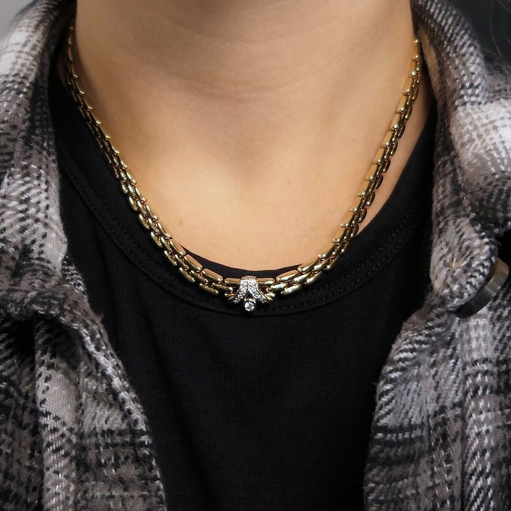 Exclusive gold Bismarck link necklace. The link at the center of the neck is detailed with diamonds, set in white gold. A stunning and luxurious piece of jewelry for the neck. The necklace is crafted from 14-karat yellow gold (585/1000).