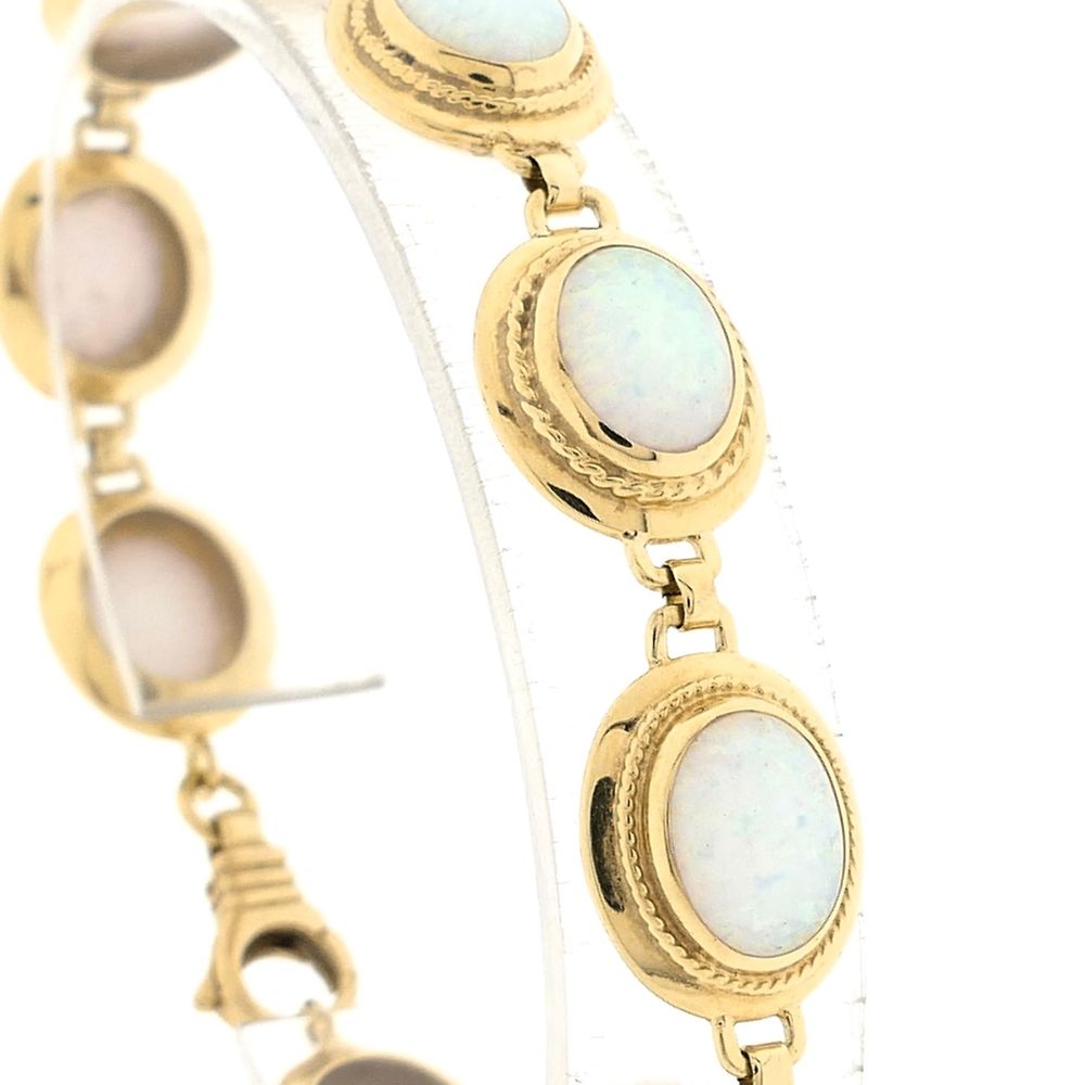 Gold bracelet set with beautiful precious opals. The links have a smooth finish. A luxurious piece of jewelry for your wrist that sparkles in the reflection of light. The bracelet is crafted from 14-karat yellow gold (585/1000).
