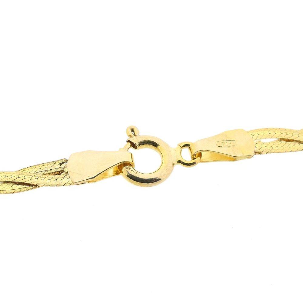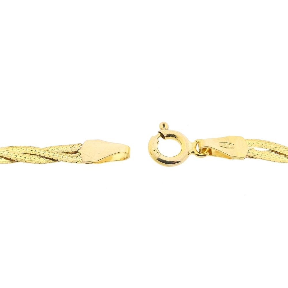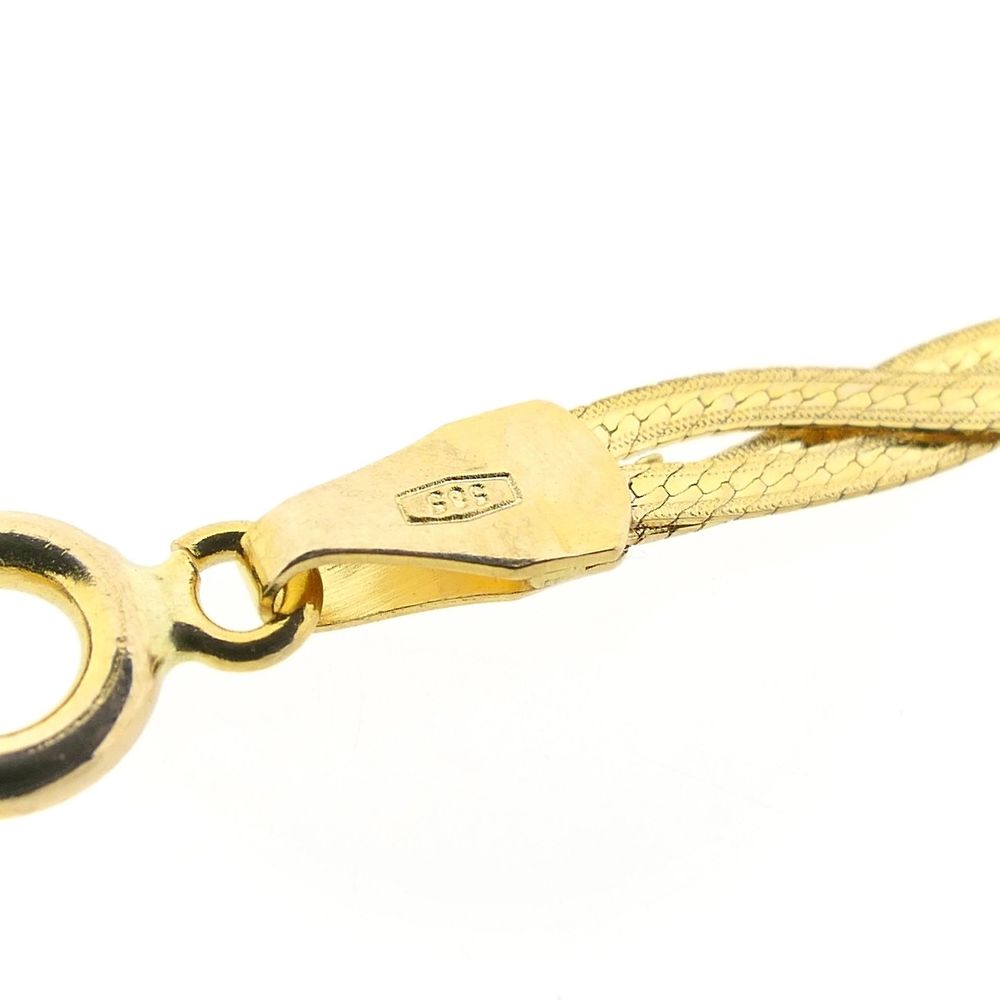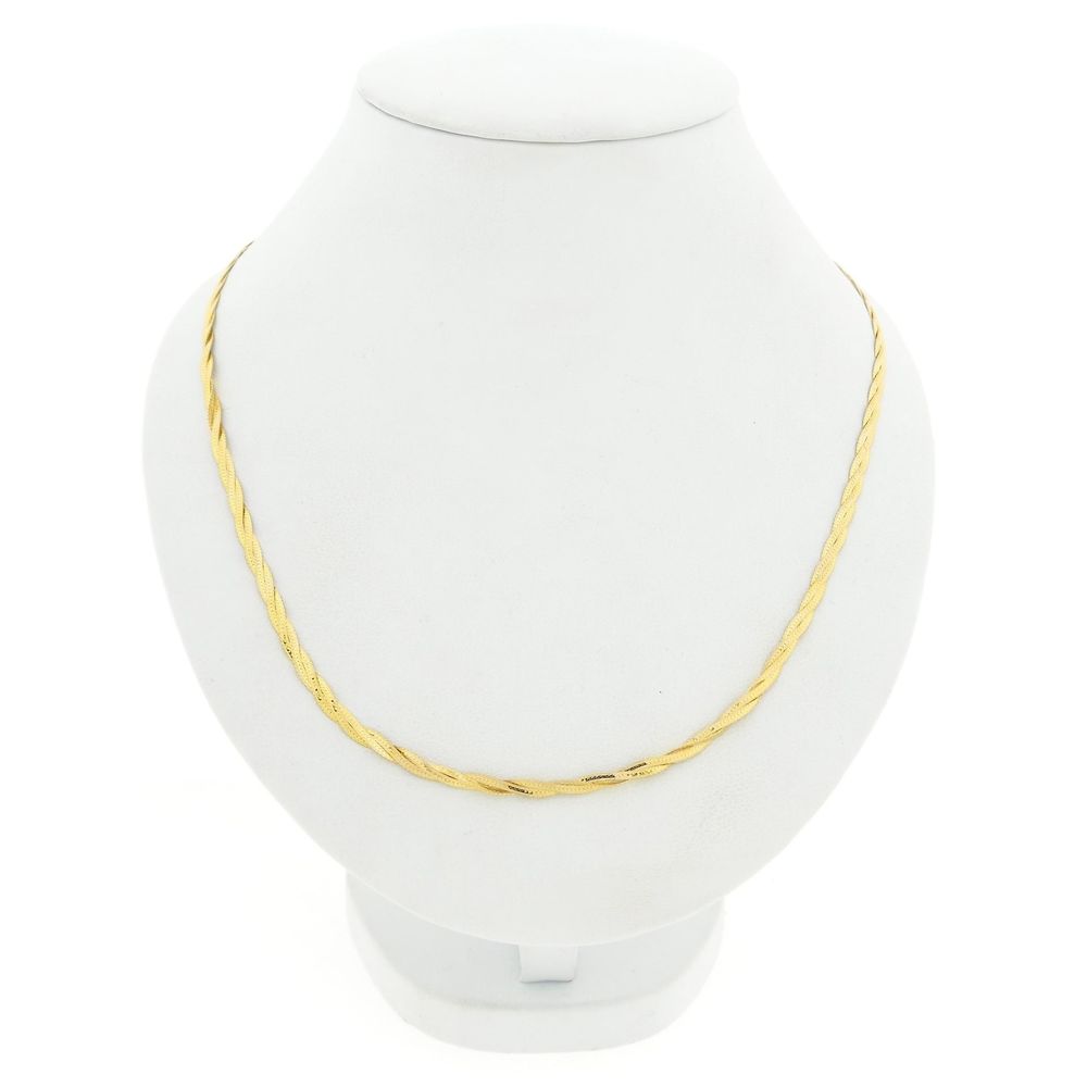 A gold braided necklace made with decorative links. The links are tightly spaced, creating a beautiful, lustrous look. This stunning women's necklace is crafted from 14-karat yellow gold (585/1000).