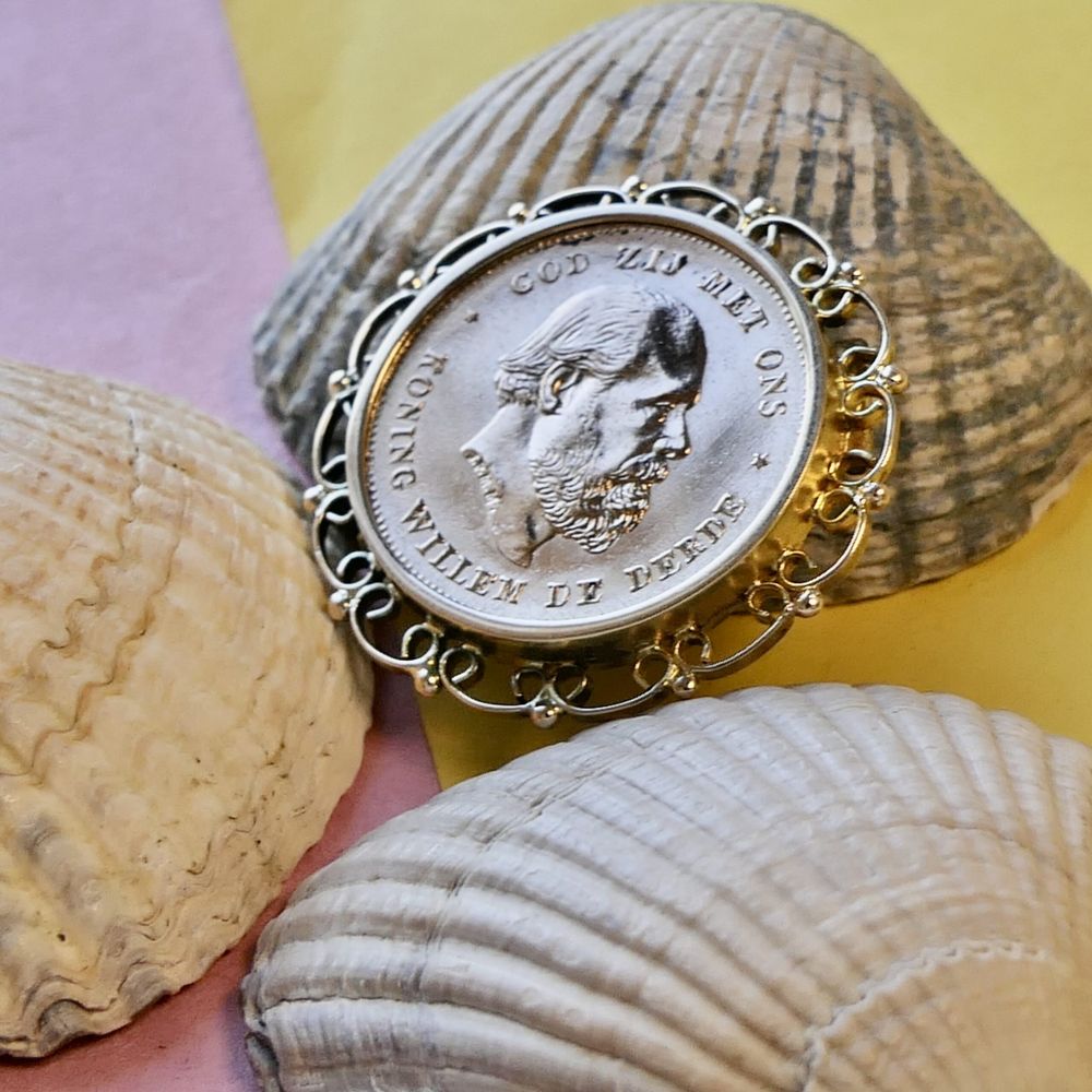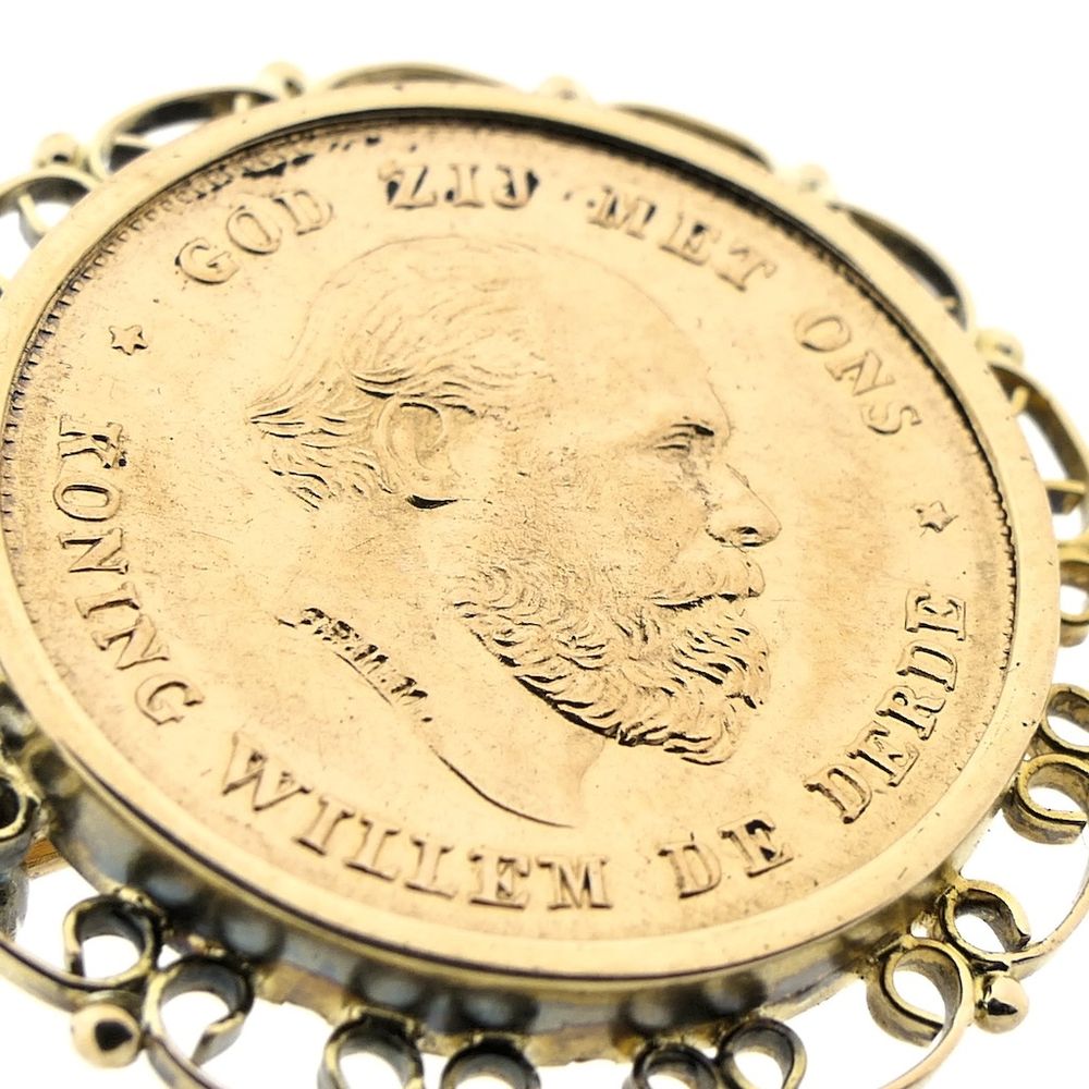 Gold brooch made with a 10-guilder coin of King William III from 1875. The coin is in excellent condition. The coin has an elegant, faceted border. The obverse side of the coin features the inscriptions "God zij met ons" (God be with us) and "King William III" (King William III) with a portrait of King William III. The reverse side of the coin features the inscriptions "Koninkrijk der Nederlanden" (Kingdom of the Netherlands), "10 G," the year the coin was minted, and the Dutch coat of arms. The border of the coin is made of 14-carat gold (585/1000), and the coin is made of 21.6-carat gold (900/1000).