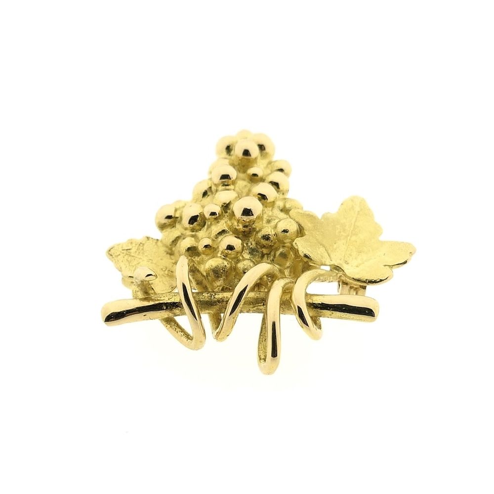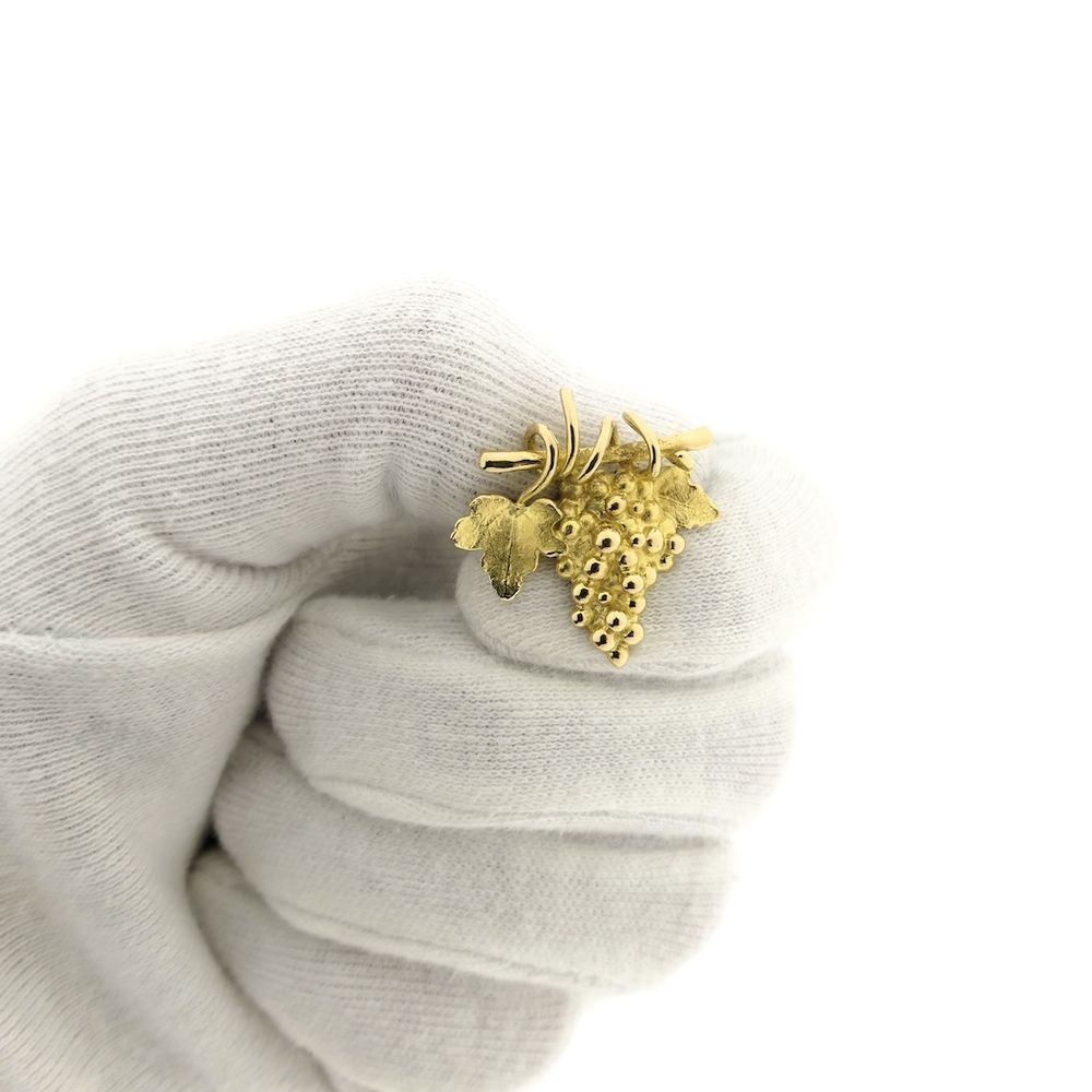Gold brooch depicting a bunch of grapes. The leaves are matted and the grapes have a few shiny spheres. The leaves and grapes hang gracefully from a branch. The brooch is made of 18-karat yellow gold (750/1000).