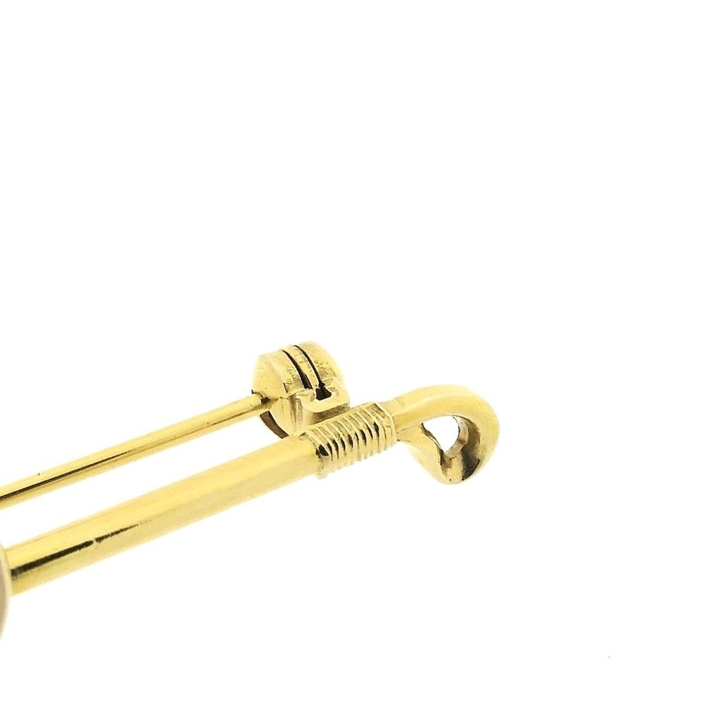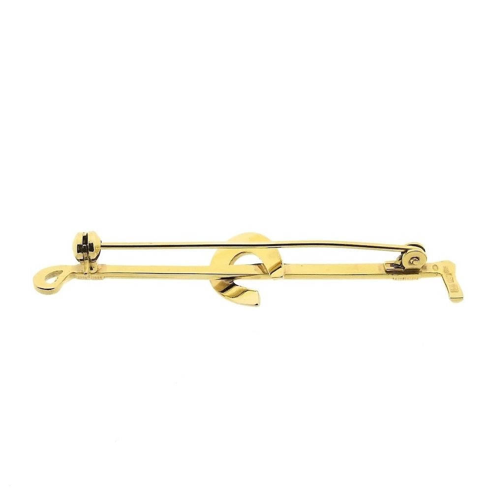 Vintage gold brooch featuring a riding whip and horseshoe. This piece is crafted from 14-karat yellow gold (585/1000).