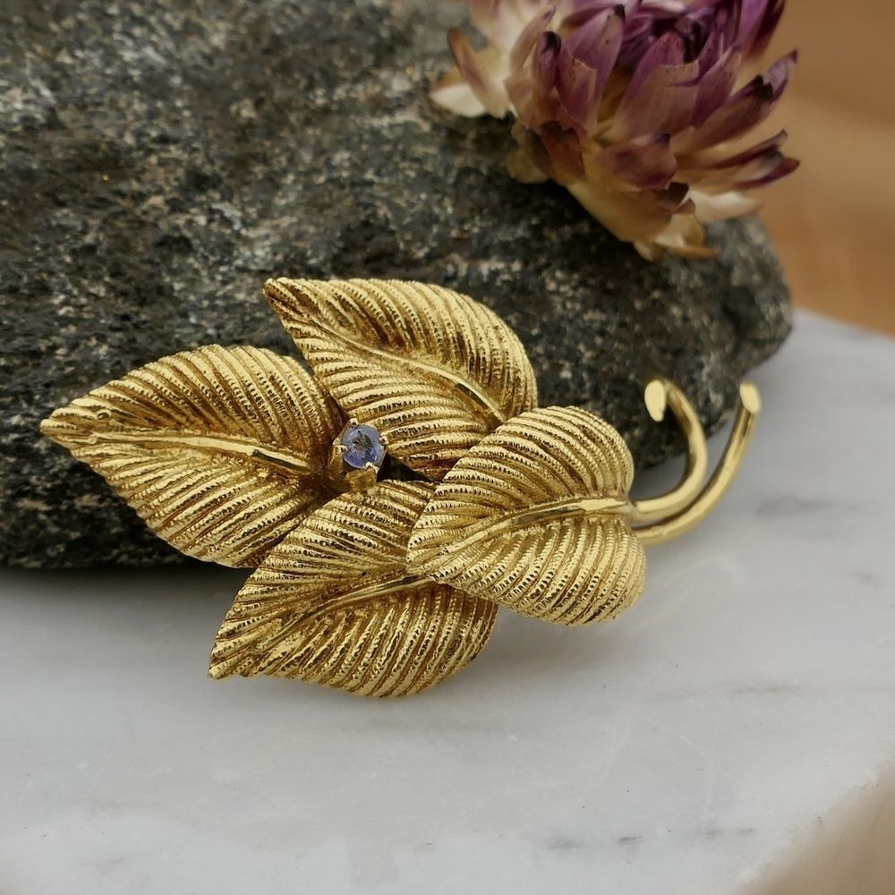 Gold brooch of leaves with sapphire