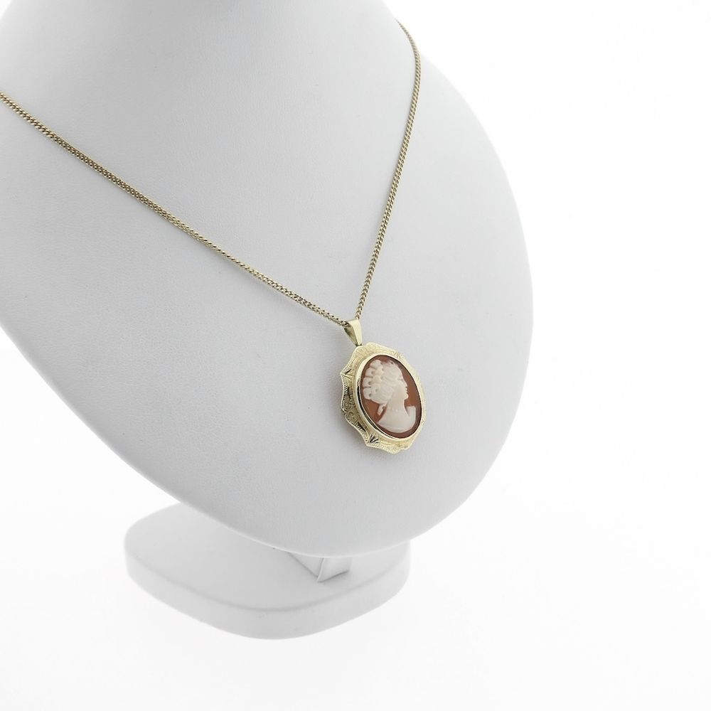 Antique gold brooch/pendant set with a cameo. The cameo features a beautifully carved portrait of a woman. The frame gives the piece an antique look and is crafted from 14-karat yellow gold (585/1000).