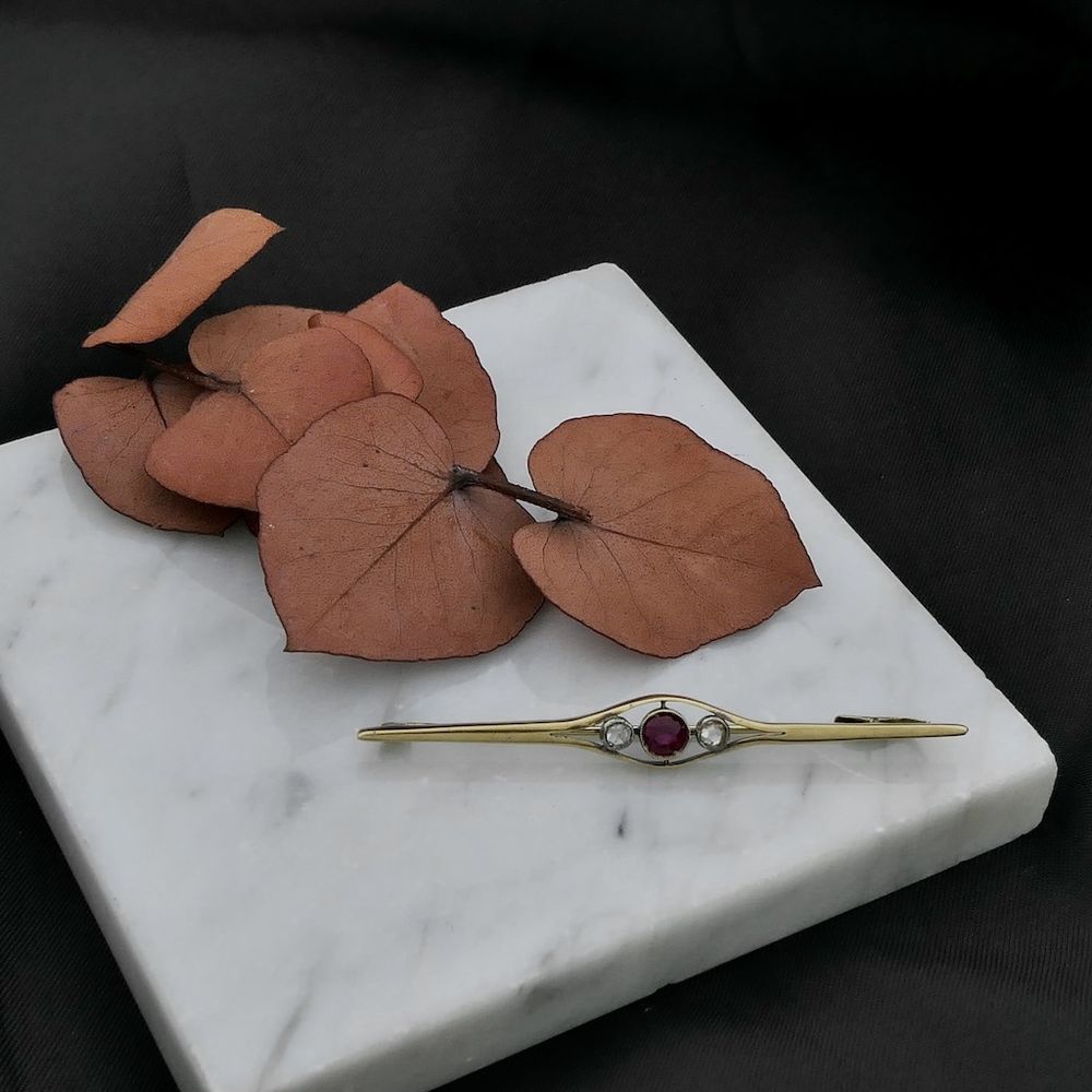 This gold brooch is set with a round brilliant-cut ruby and two rose-cut natural diamonds. The brooch has a vintage design. A beautiful and striking accessory. Crafted from 18-karat yellow gold (750/1000), it is a statement piece.