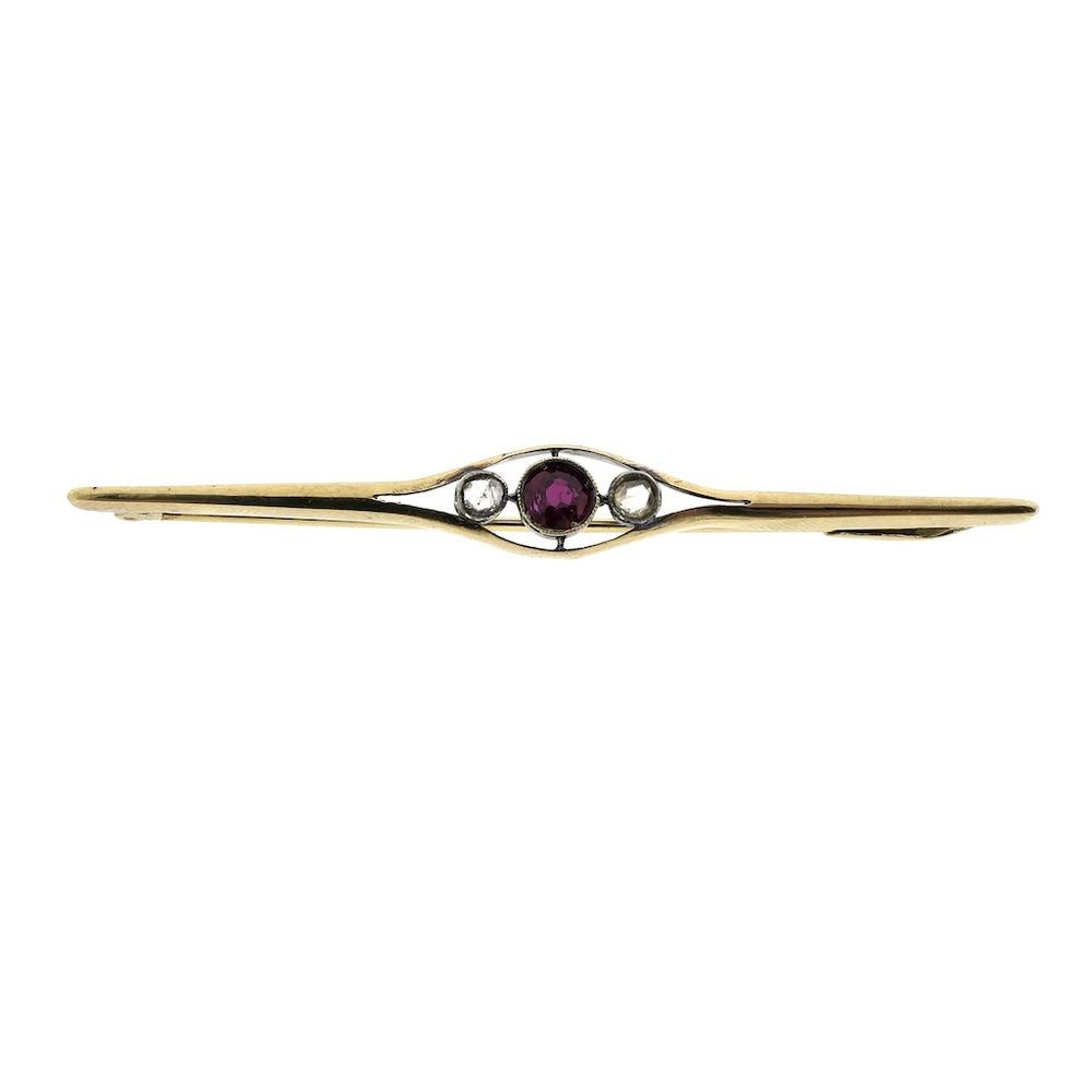 Gold brooch with ruby and diamonds; 0.12 ct.