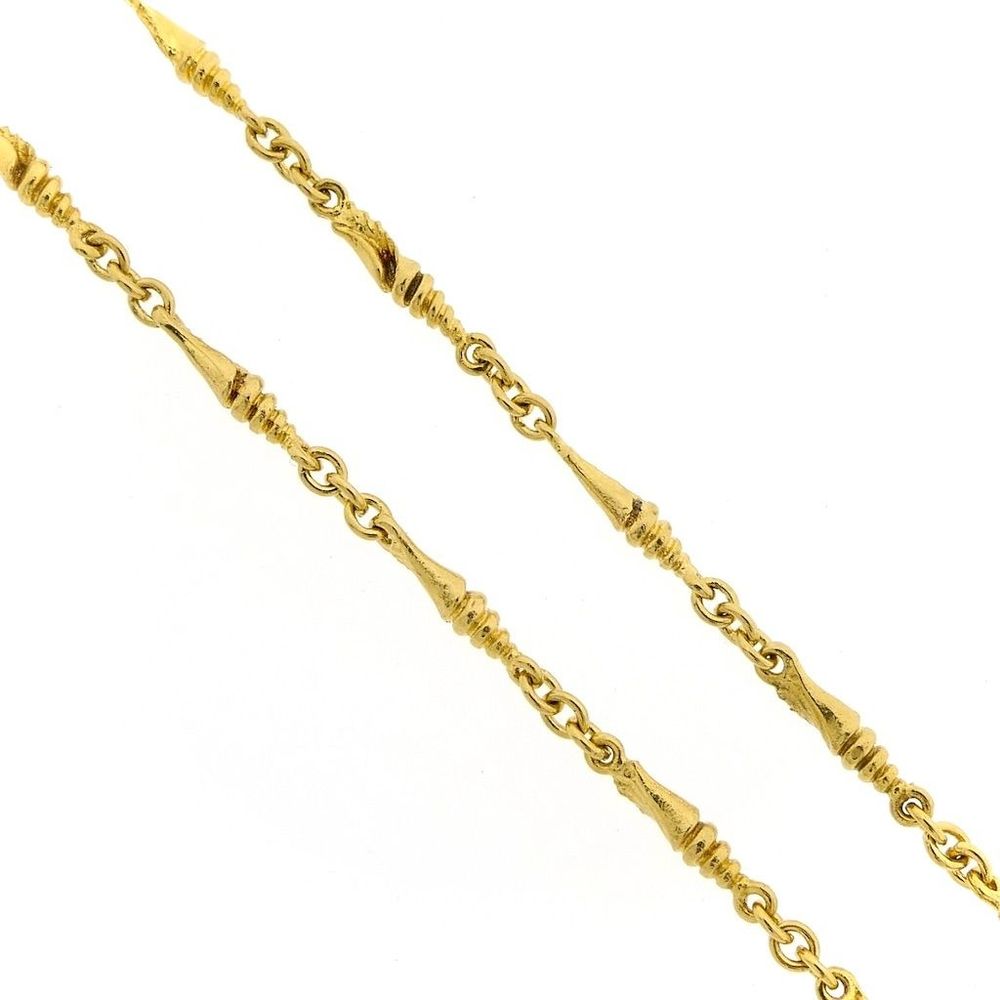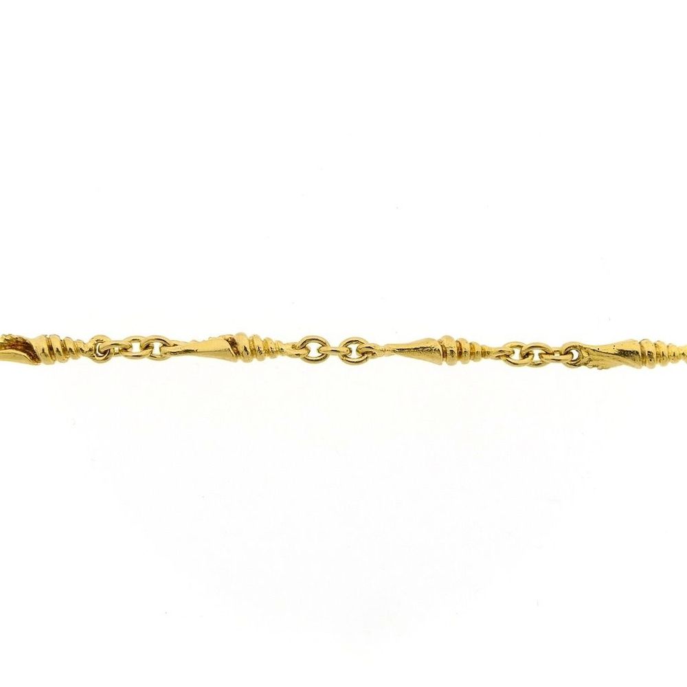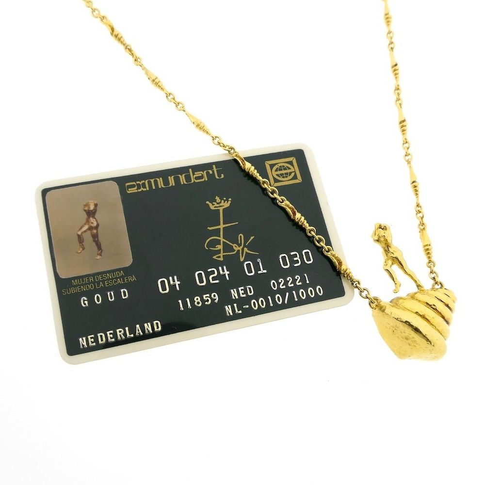 Exclusive 18K gold necklace/bracelet by the artist Salvador Dalí, "Mujer Desnuda Subiendo la Escalera." Also known as "Naked Woman Climbing the Ladder." The necklace can be worn long or shortened; the remaining part can be worn as a bracelet. The chain is made with links that resemble long shells. It is a sturdy piece of jewelry, entirely made of solid 18-karat yellow gold (750/1000). The necklace and bracelet were designed by Salvador Dalí and are a tribute to Marcel Duchamp's painting "Nude Descending a Staircase." The painting is not original; it referenced the photographs of Eadweard Muybridge. These were photographs of moving animals, the photographs belonging to the first series. His contemporary Joan Miró made a drawing of this with pencil and charcoal during the Spanish Civil War in 1937. In the drawing, a woman with heavy limbs can be seen reaching for a ladder. The ladder represents escape/fleeing, the woman has great difficulty climbing the stairs. This work is said to be related to Naked Descending a Staircase by Marcel Duchamp. Salvador Dalí's model climbs stairs, just like Joan Miró's work; in Dalí's work, the stairs are shells that represent vast oceans, and the links are also shells. Salvador Dalí When you think of Dalí, you think of his famous upturned moustache and his surrealist artwork. In addition to his artwork, he was also involved in film and visual arts, and he also created work for a jewelry collection. The necklace/bracelet comes with a certificate and signature of Salvador Dalí. Limited Edition, of 1000 pieces, this necklace is numbered: 0010/1000. Necklace length: 64 cm or 45 cm Bracelet length: 19 cm