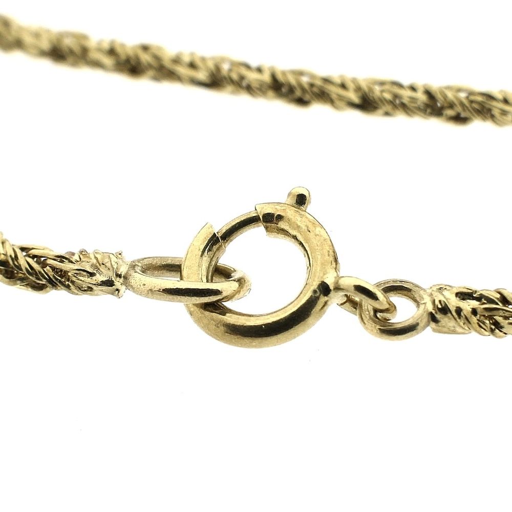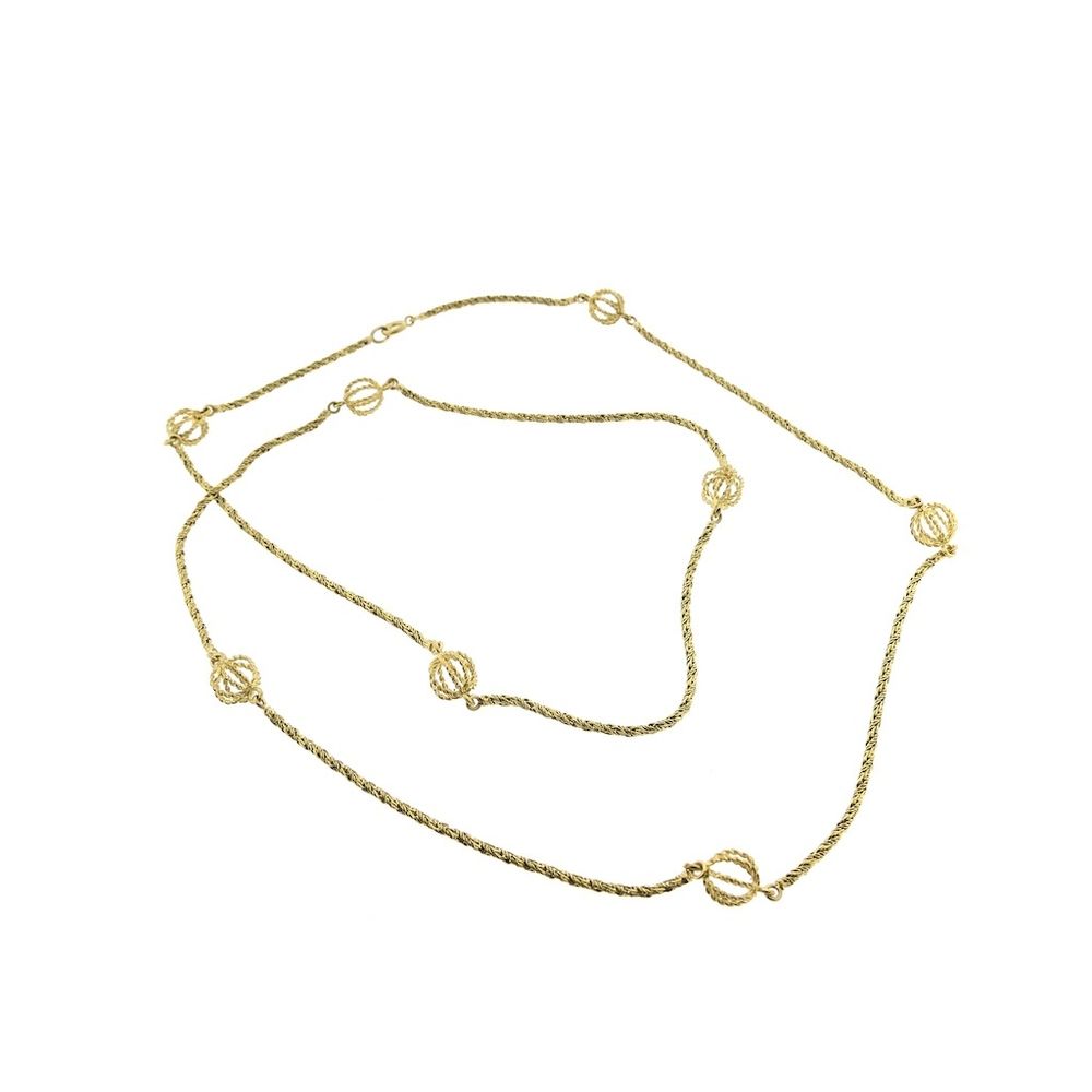 Long gold necklace with small beads. The chain is made of twisted links, with an open bead every 10 cm. This necklace is crafted from 14-karat yellow gold (585/1000).