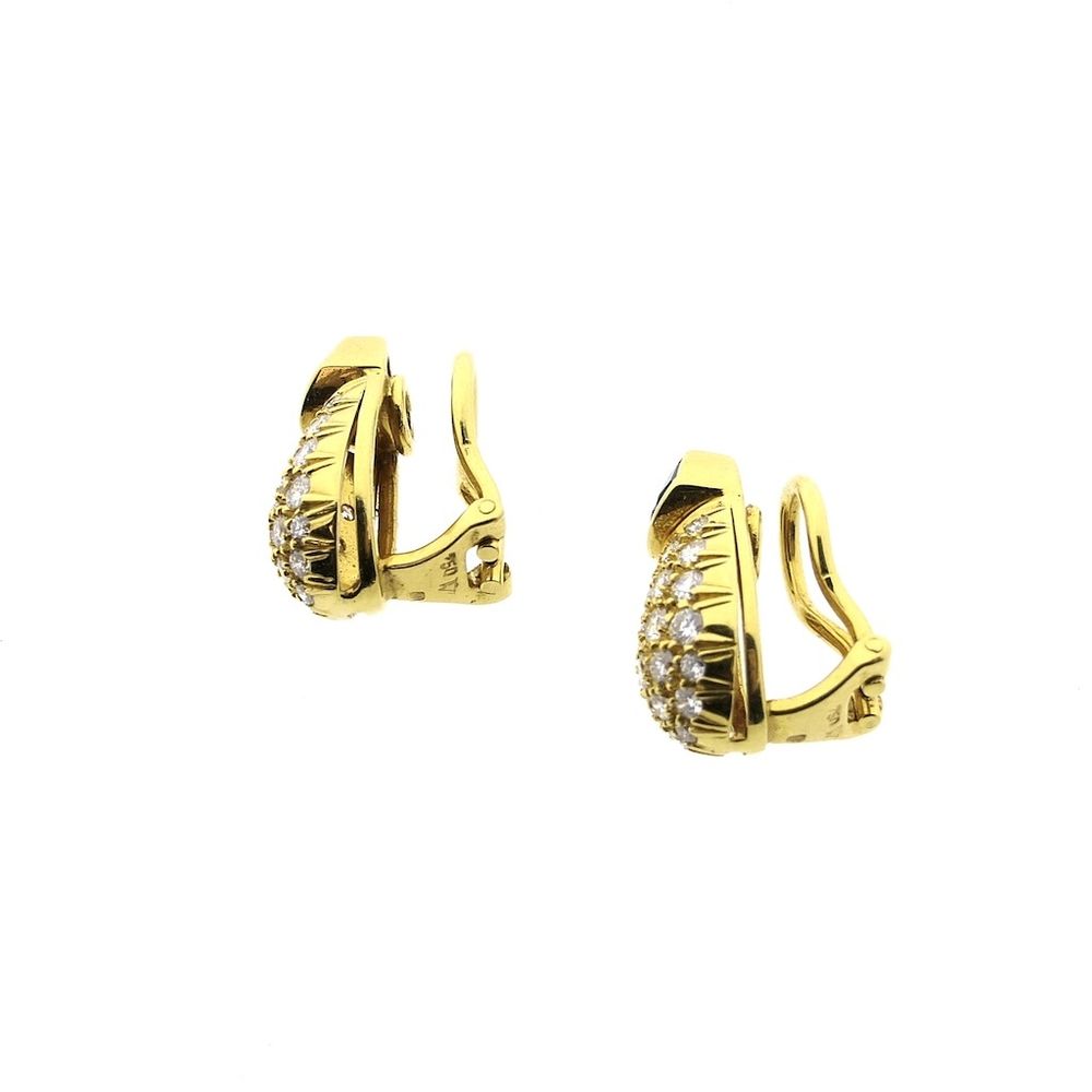 Gold clip-on earrings set with approximately 1.00 ct. of round brilliant-cut natural diamonds and baguette-cut sapphires. The diamonds are set in yellow gold, creating a beautiful contrast. These luxurious clip-on earrings close with a clip clasp. Crafted from 18-karat yellow gold (750/1000), they are a true gemstone.