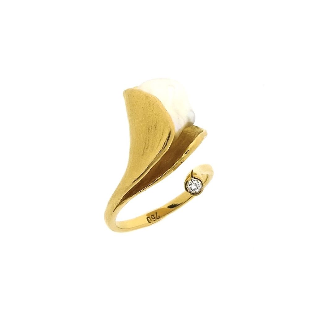 Gold cocktail ring. The ring is set with a baroque pearl and a 0.05-carat round brilliant-cut lab diamond. The ring has a unique and elegant design. The piece is crafted from 18-karat yellow gold (750/1000).