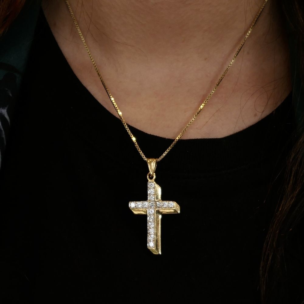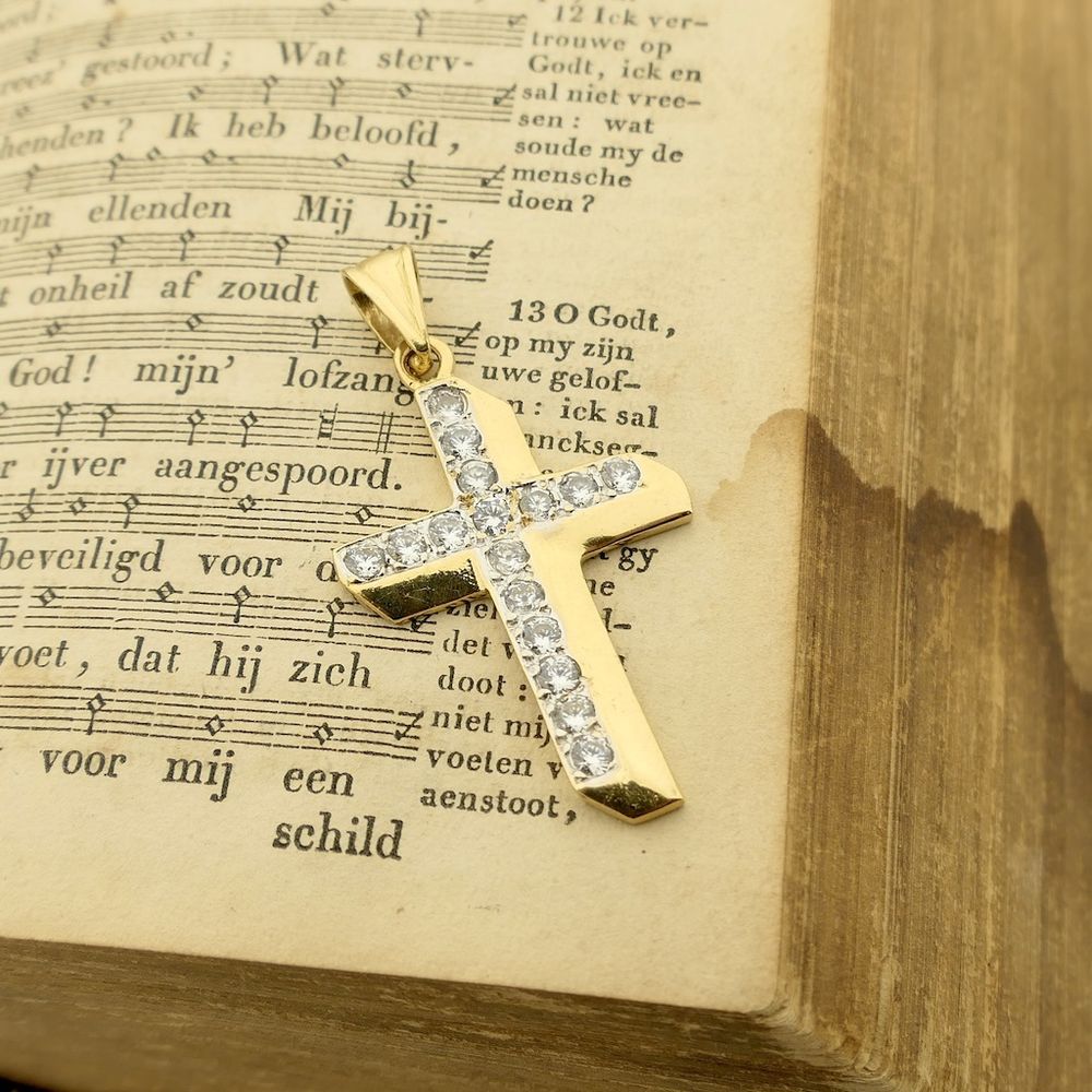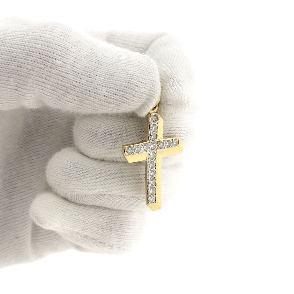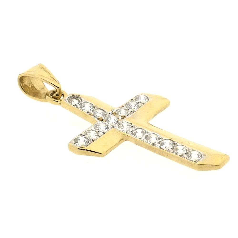 A flat gold pendant of the cross of Christ set with beautiful round brilliant-cut zirconia. A three-dimensional design. This beautiful pendant is crafted from 14-karat yellow gold (585/1000).