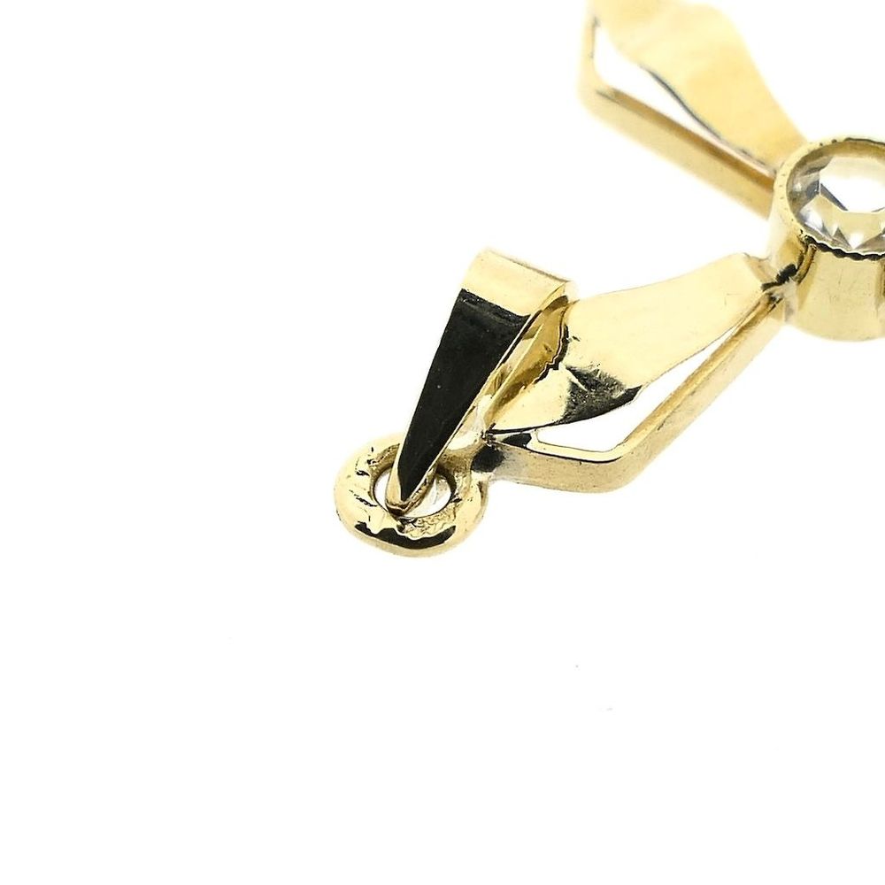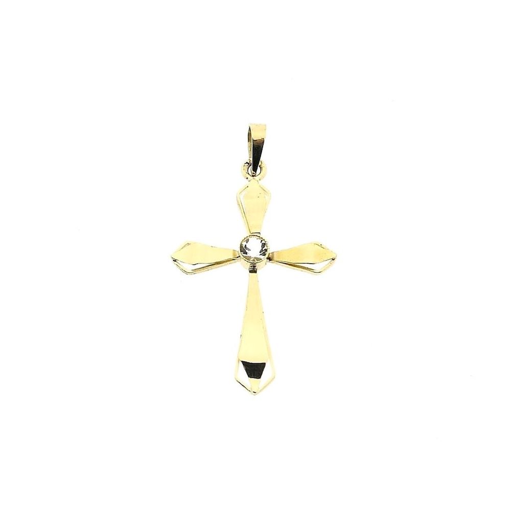 Gold pendant of a cross. The cross is ornately crafted and set with a zirconia. A subtle and religious piece of jewelry crafted from 14-karat yellow gold (585/1000).