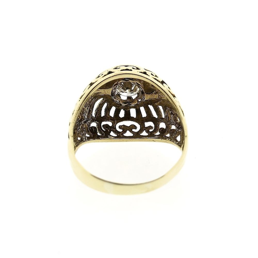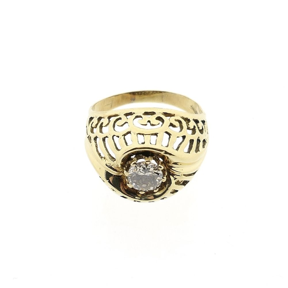 A domed gold ring set with a large, round, brilliant-cut lab diamond. The ring has an elegant appearance and is crafted from 14-karat yellow gold (585/1000).