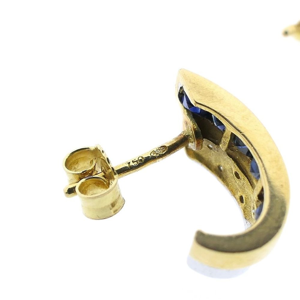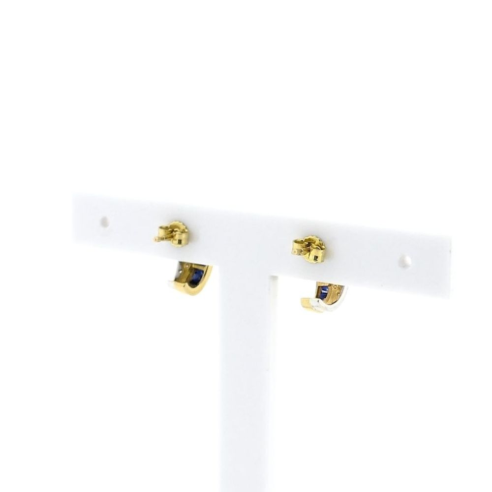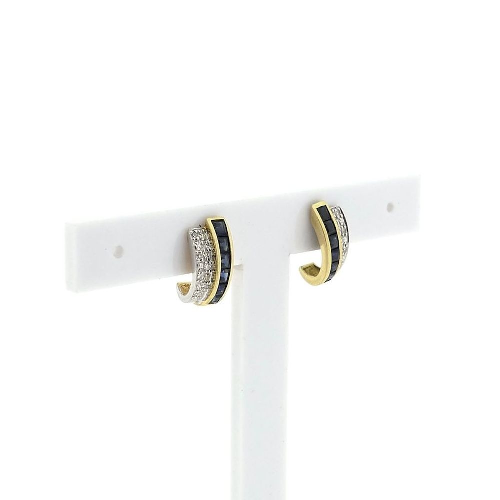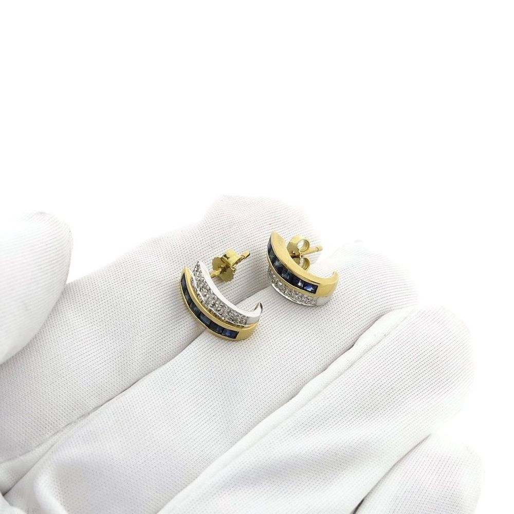 Two-tone gold earrings set with sapphires and diamonds. The diamonds are set in white gold, making them stand out even more. A beautiful pair of earrings crafted from 14-karat white and yellow gold (585/1000).