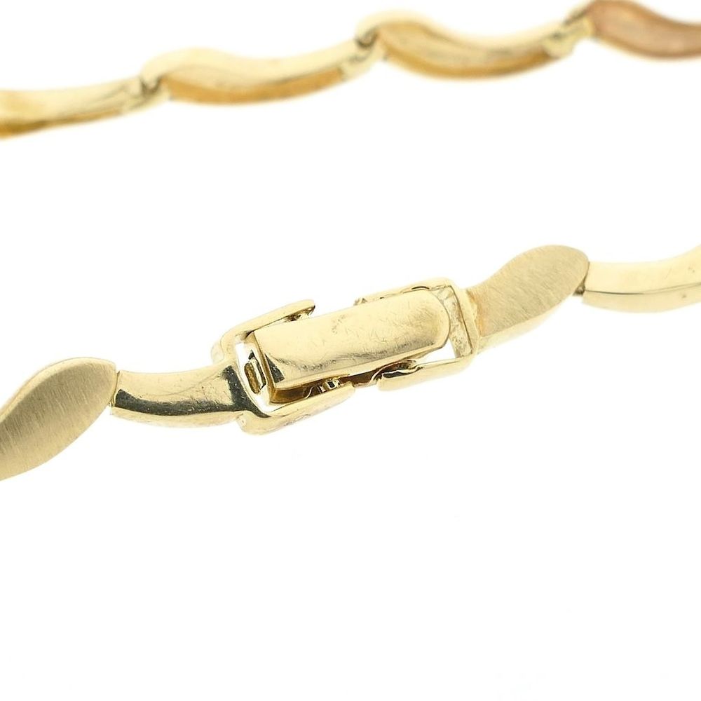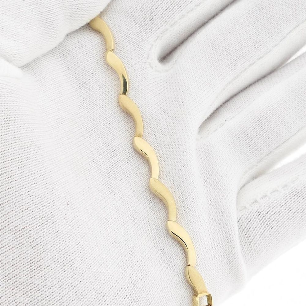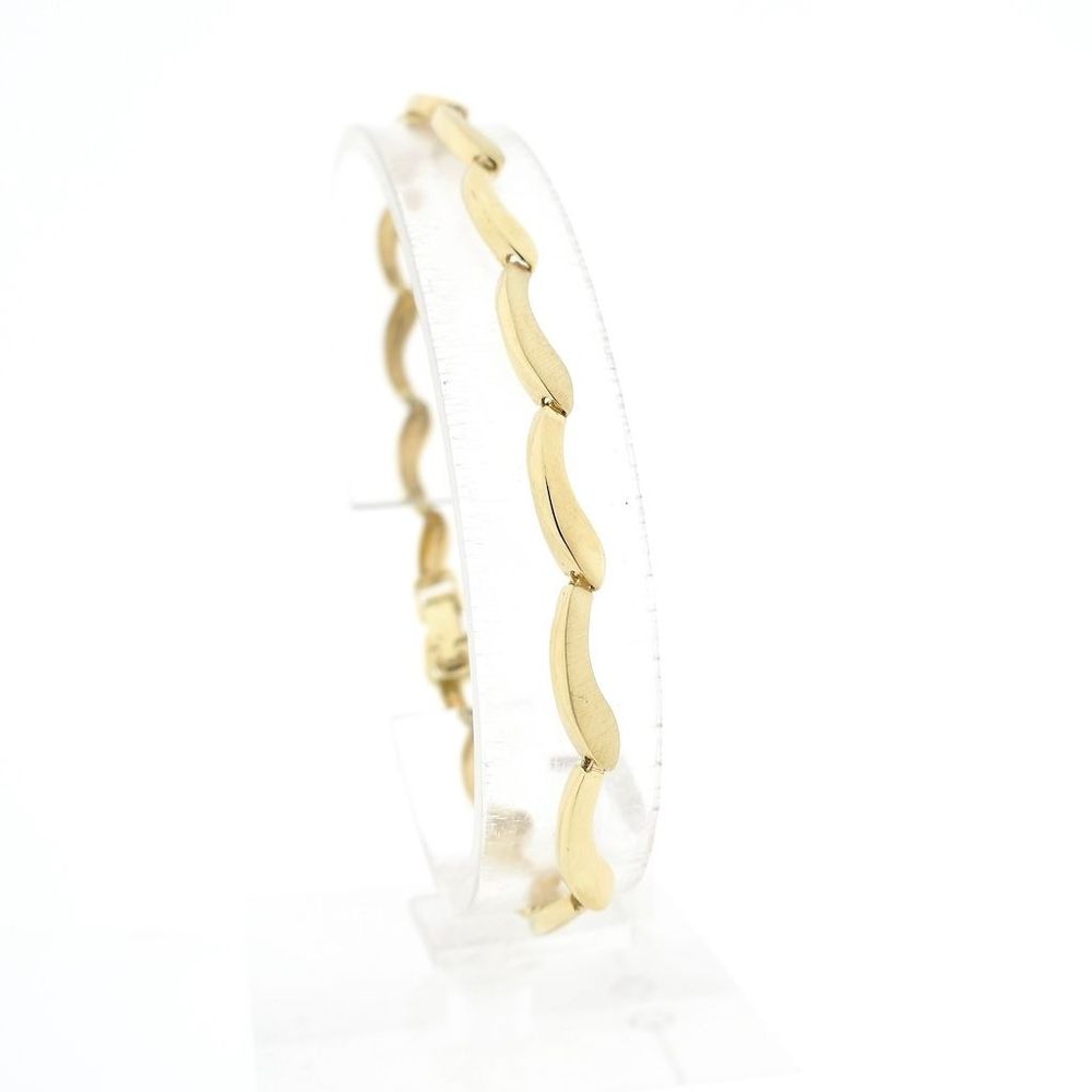 Gold bracelet with a decorative link. The links alternate between polished and matte. The links have an oval, wavy shape. The bracelet is made of 14-karat yellow gold (585/1000).