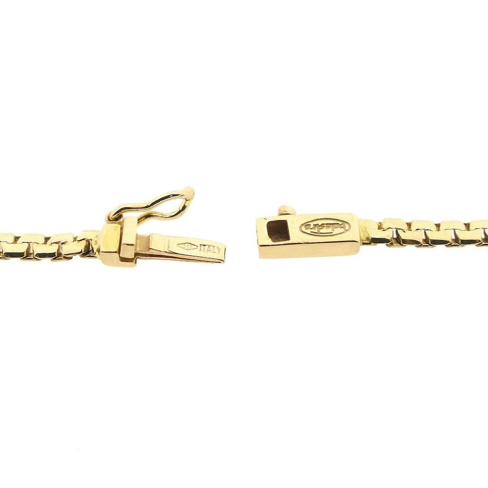 Gold fantasy link necklace. The links are 2.5 mm wide. The clasp is engraved with the Italian brand "Balestra." The necklace has a polished finish and closes with a box clasp with a safety hook. The piece is crafted from 14-karat yellow gold (585/1000).