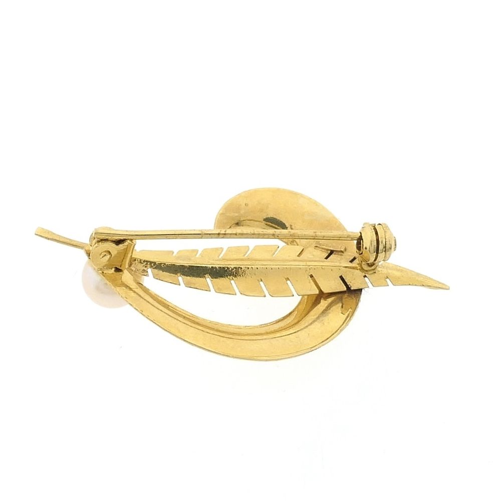 Vintage gold brooch in the shape of a feather with a pearl. The feather has a smooth finish, and the curl is matte. A pearl with a diameter of 5.6 mm is set on the left side. This beautiful piece is crafted from 14-karat yellow gold (585/1000).