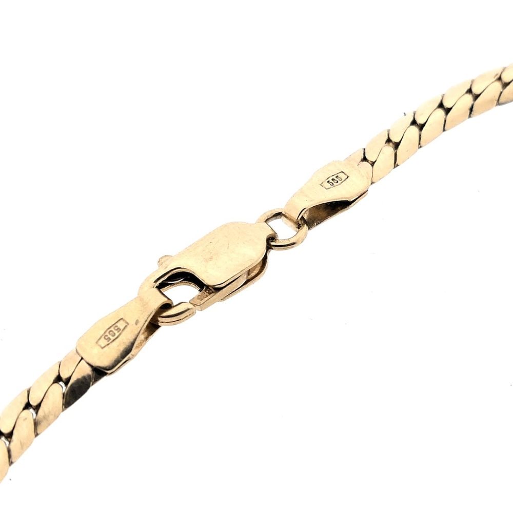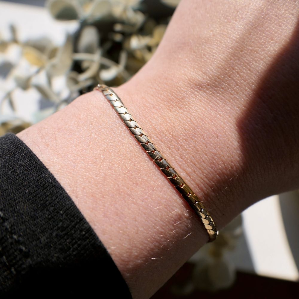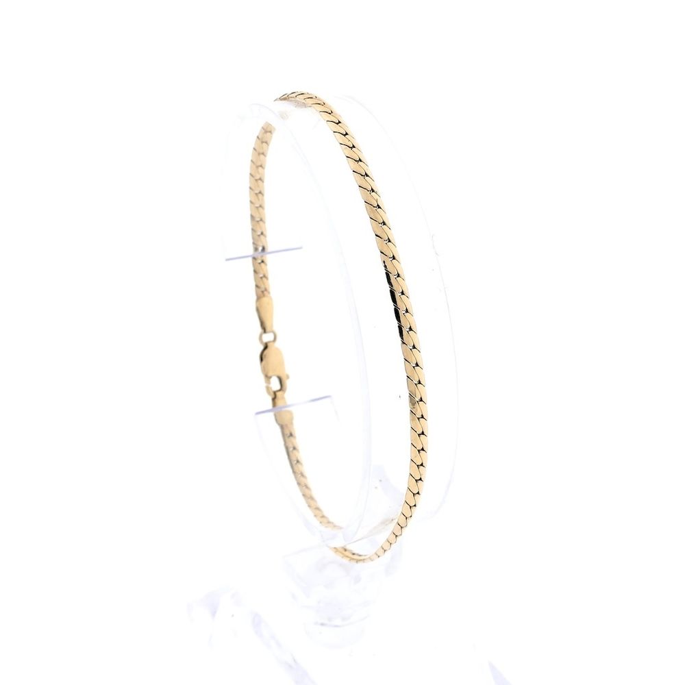 Gold flat curb link bracelet. This bracelet features flat curb links with a link width of 2.8 mm. It has a modern look and can be worn solo or layered with other bracelets. The bracelet closes with a lobster clasp and is crafted from 14-karat yellow gold (585/1000).