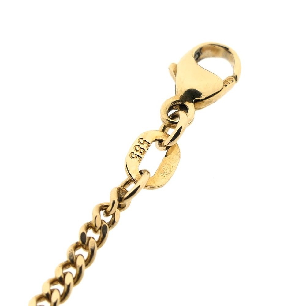 Gold flat curb link necklace. The links are 2.0 mm wide. The necklace is suitable for a small to medium-sized pendant or can be worn without a pendant. A classic and timeless piece. The necklace closes with a lobster clasp and is crafted from 14-karat yellow gold (585/1000).