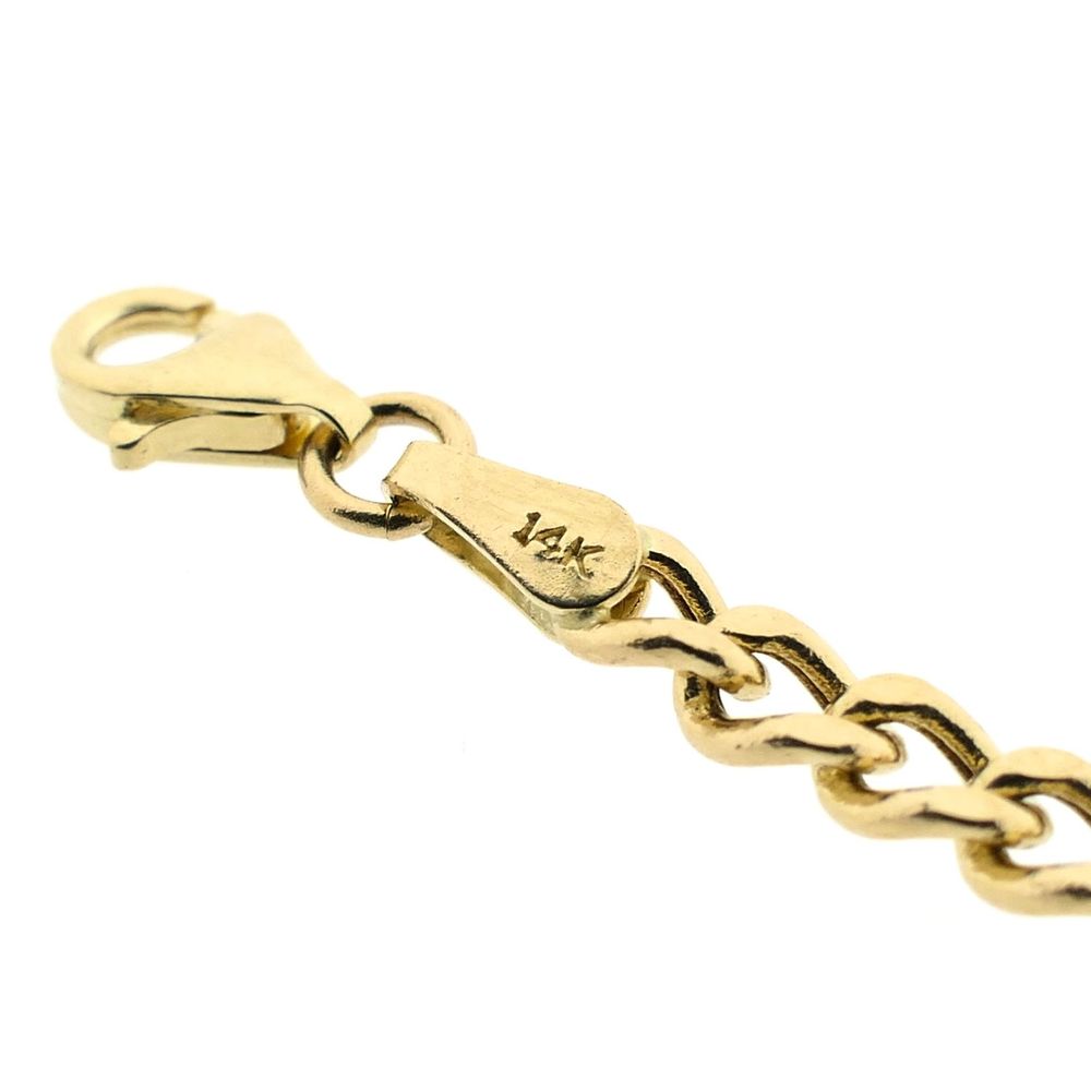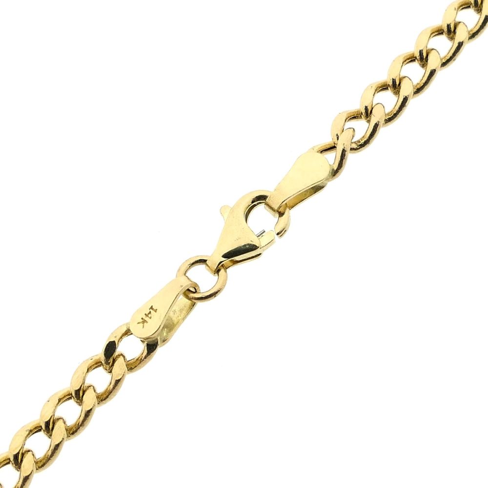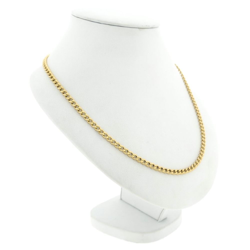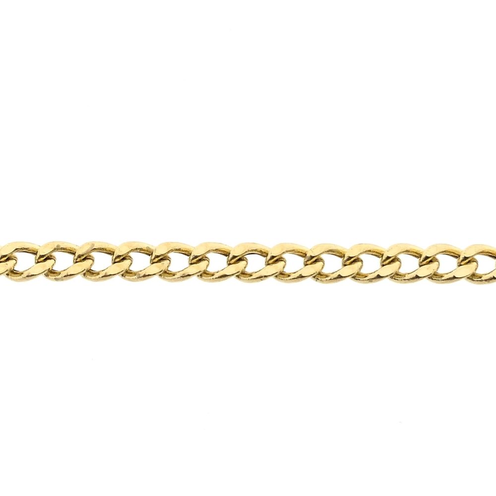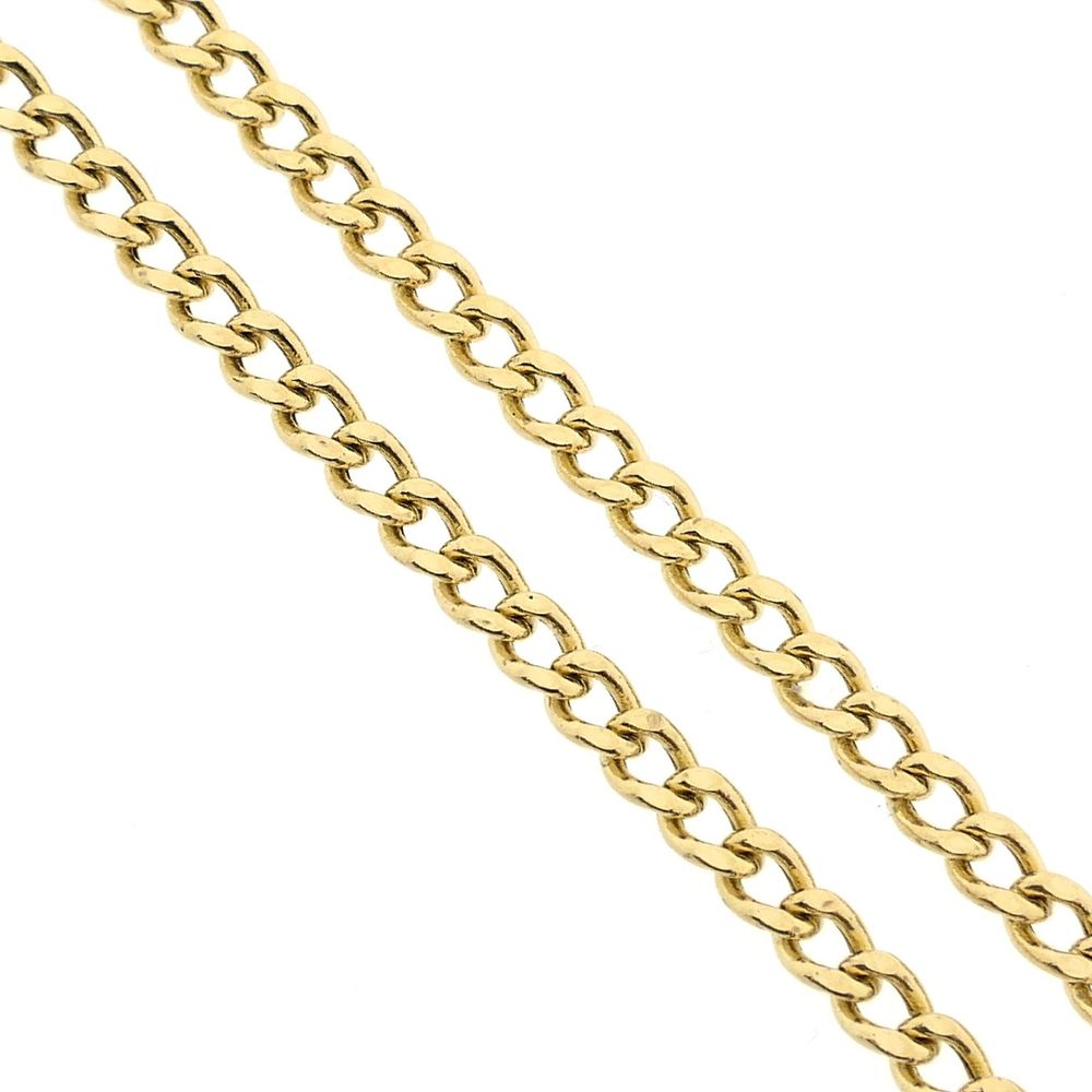 Gold flat curb link necklace. The links are 3.6 mm wide. The necklace is suitable for a small to medium-sized pendant or can be worn without a pendant. A classic and timeless piece. The necklace closes with a lobster clasp and is crafted from 14-karat yellow gold (585/1000).