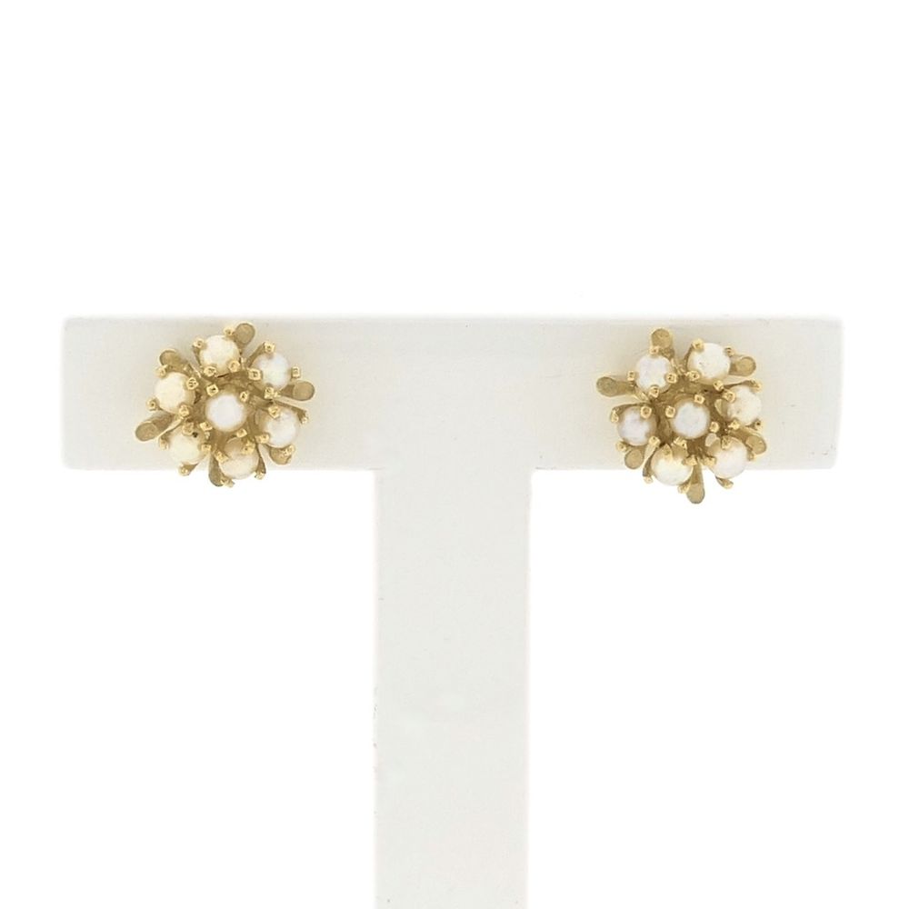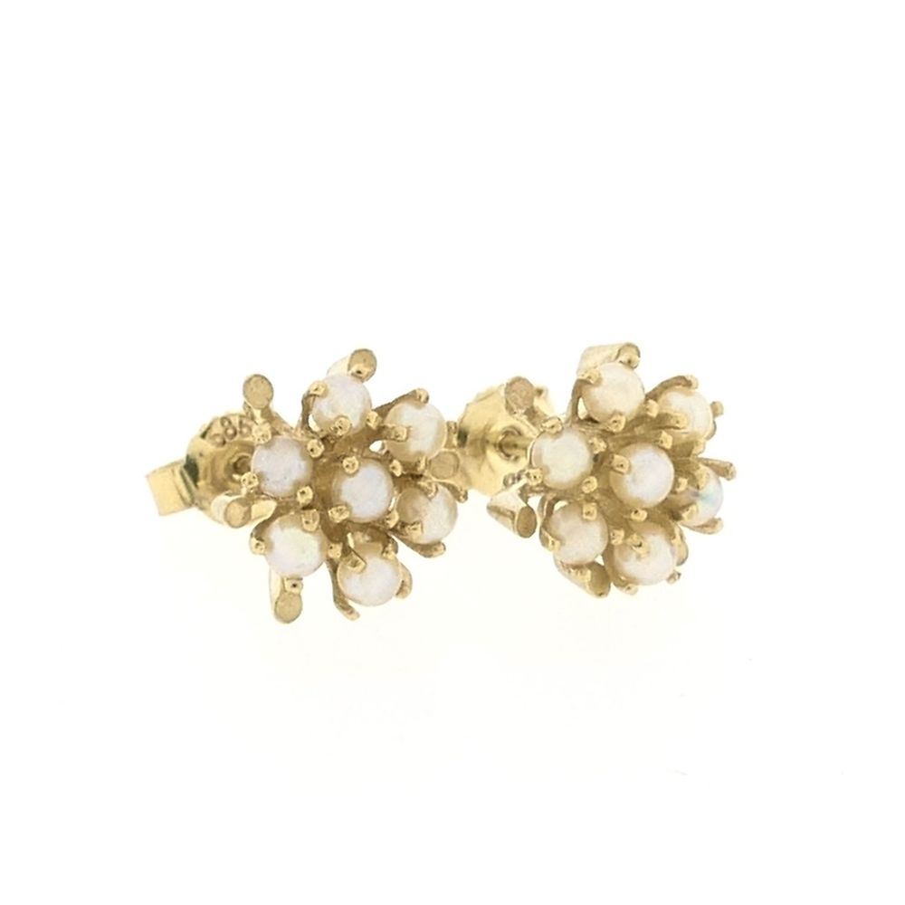 Gold floral stud earrings set with cultured pearls. The earrings have a diameter of 11.7 mm and the pearls are 2.4 mm in diameter. This beautiful set of stud earrings is crafted from 14-karat yellow gold (585/1000).