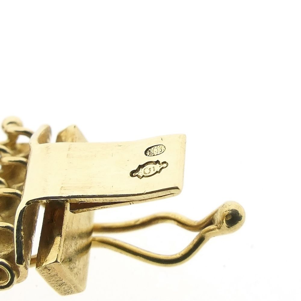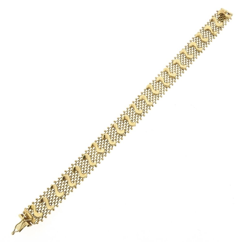 Gold link bracelet made with gallery wire. This link bracelet features a lace-like pattern, detailed with wavy figures. A beautiful piece of jewelry for the wrist. The bracelet closes with a box clasp including a safety hook and is crafted from 14-karat yellow gold (585/1000).