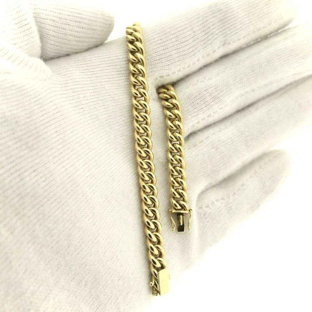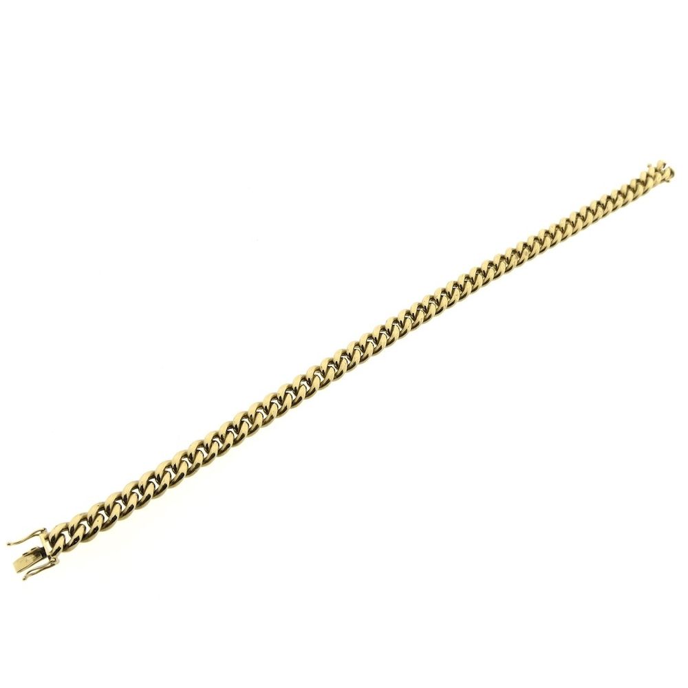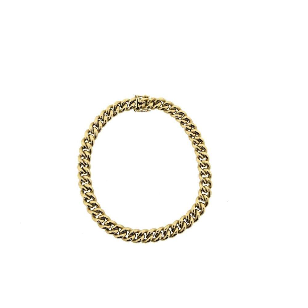 Solid gold curb link bracelet. This supple piece of jewelry has a robust and luxurious look. The bracelet has a smooth finish and closes with a box clasp with two safety hooks. Crafted from 14-karat yellow gold (585/1000), it is a durable and luxurious piece.