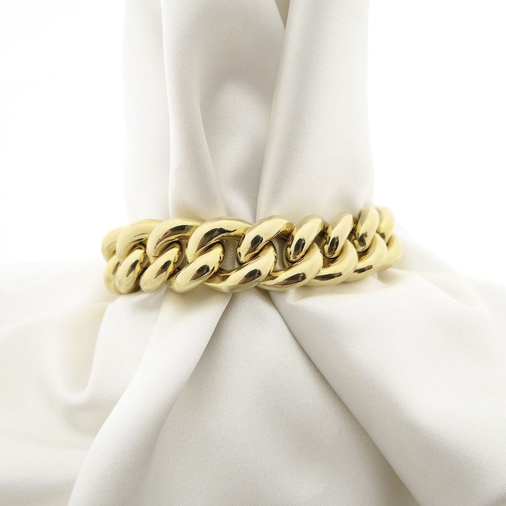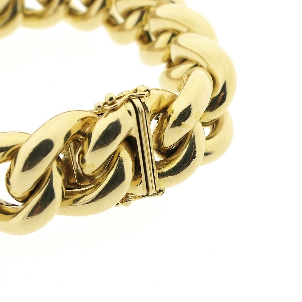 Gold bracelet made with wide gourmet links. The links have a smooth finish and a luxurious and robust appearance. A beautiful piece of jewelry suitable for both men and women. The bracelet is crafted from 14-karat yellow gold (585/1000).