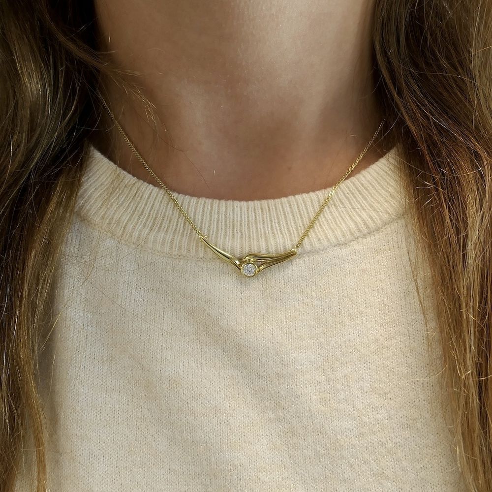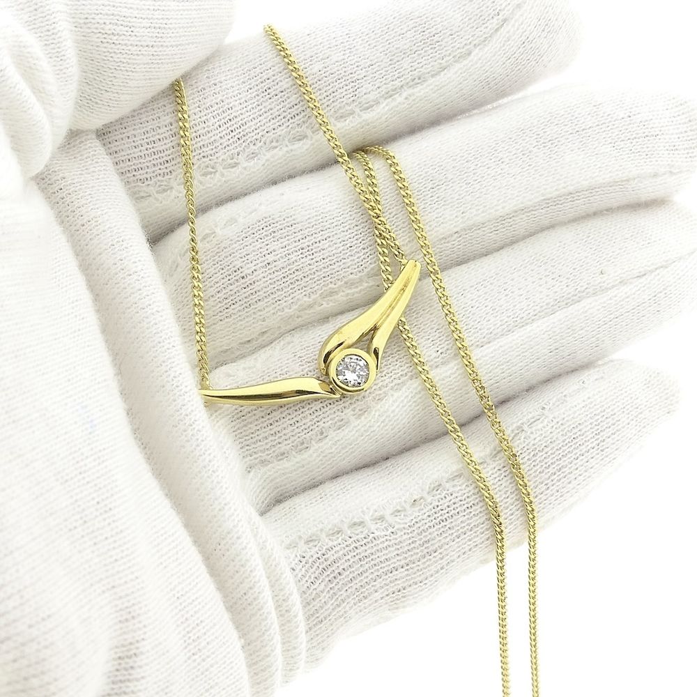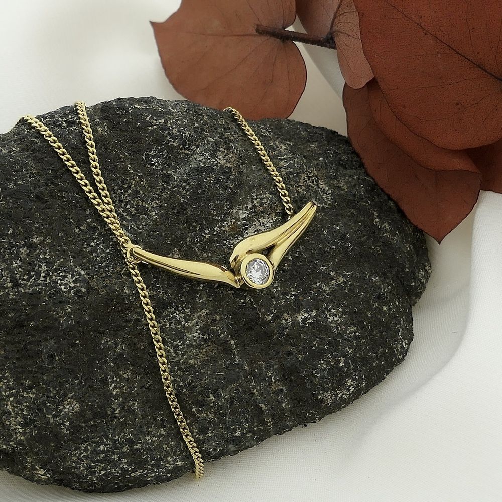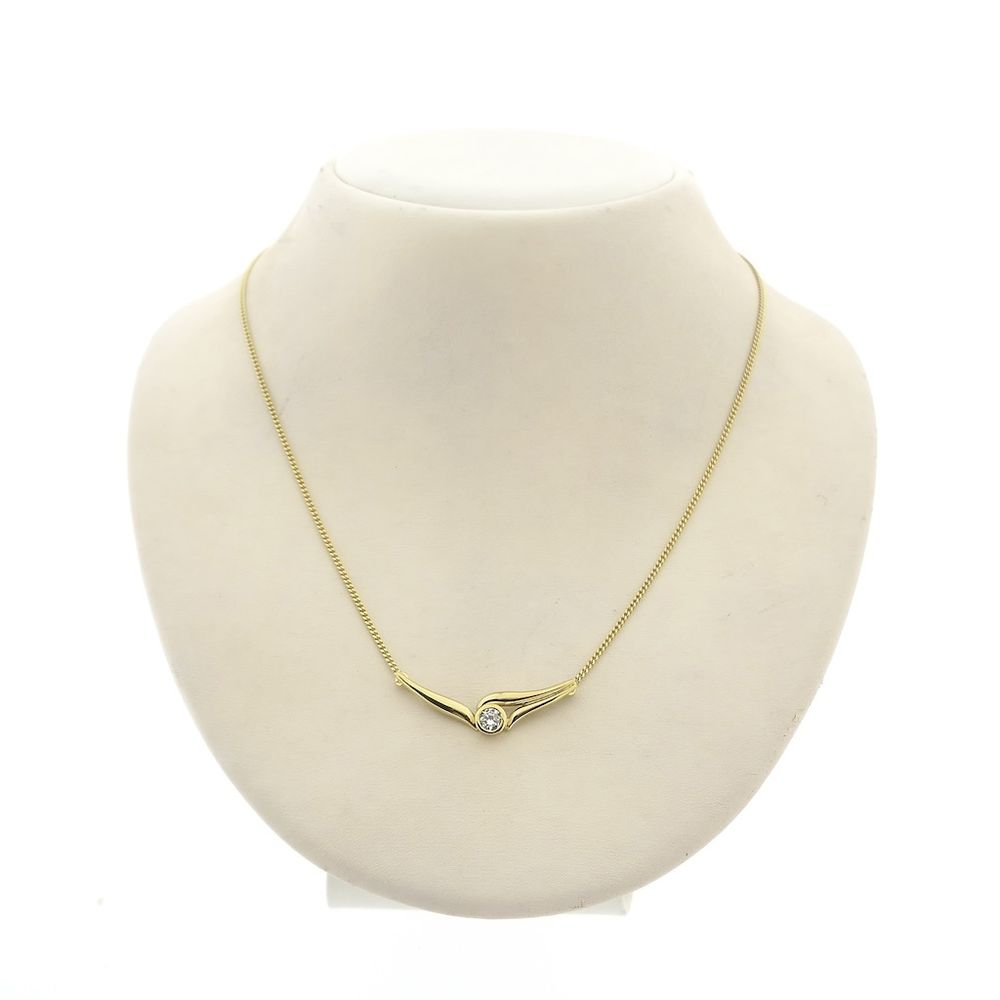 Gold gourmet link chain with a fixed pendant. A clear zirconia is set into the pendant. A subtle and elegant design. The chain is crafted from 14-karat yellow gold (585/1000).