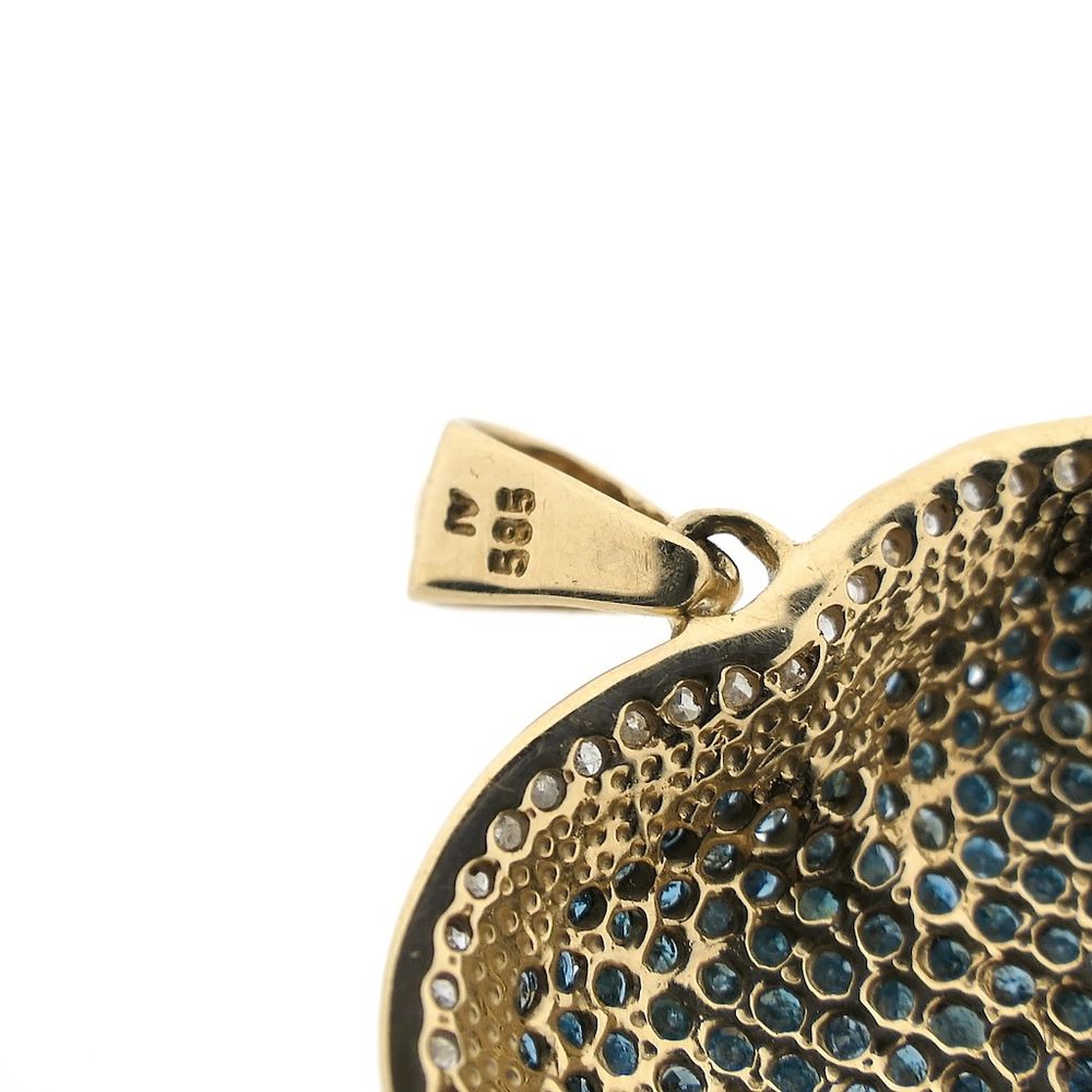 Gold heart pendant set with round brilliant-cut natural diamonds. The heart is made of yellow gold, pavé-set with blue moissanite, and surrounded by white diamonds. The total weight of the stones is approximately 2.31 ct. This stunning pendant exudes luxury. The piece is crafted from 14-karat yellow gold (585/1000).
