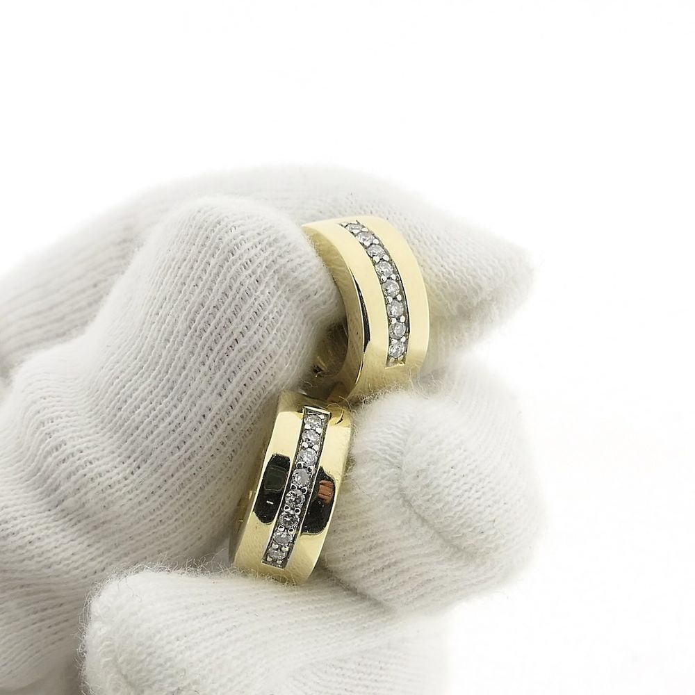 Solid gold hoop earrings set with a row of sparkling diamonds. These earrings have an elegant and luxurious look. They are crafted from 14-karat yellow gold (585/1000).