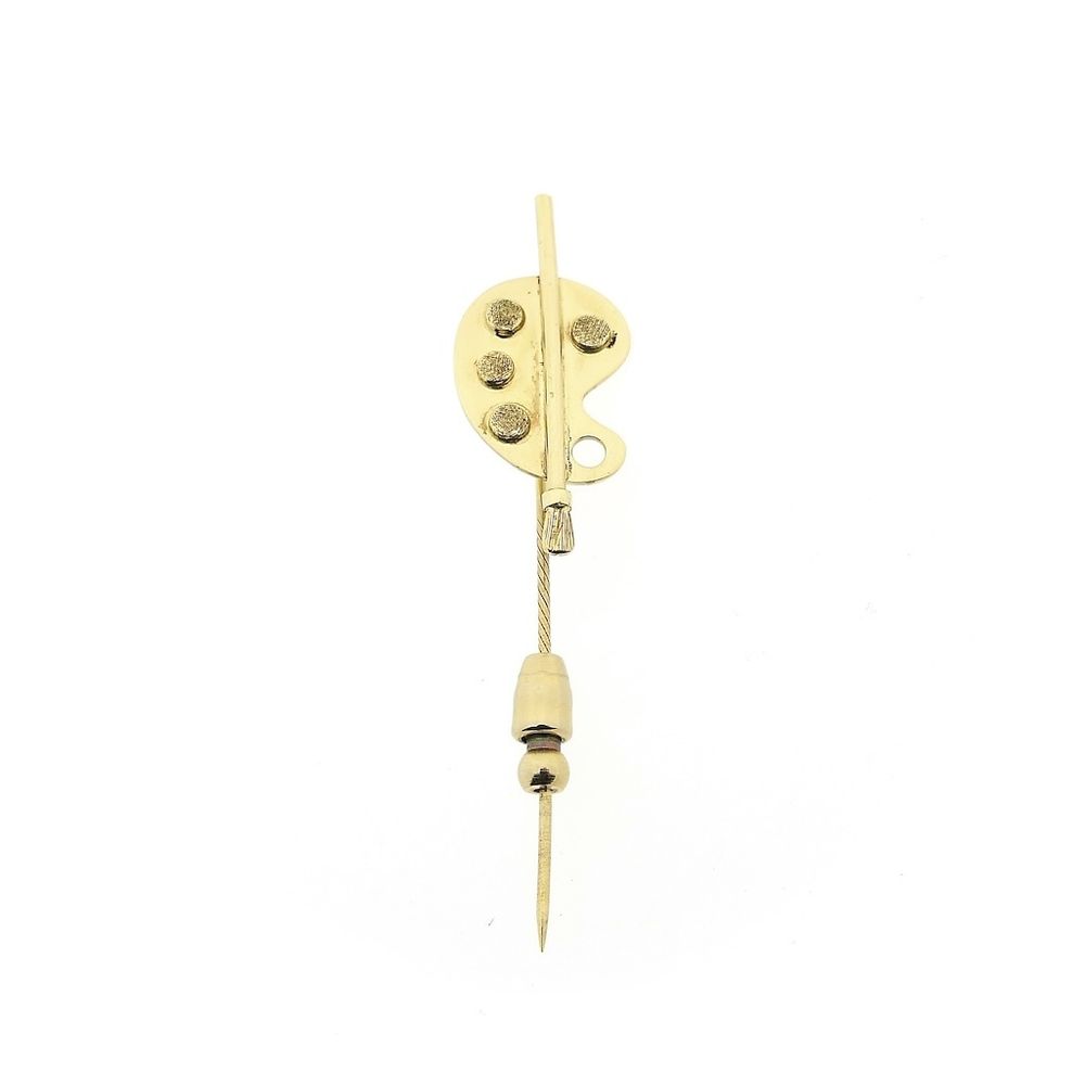 Gold lapel pin of a painter's palette. The palette is detailed with paint and a brush. This lapel pin is worn on the lapel of a jacket. It's a beautiful antique piece of jewelry that can certainly be worn again today. The pin is made of 14-karat yellow gold (585/1000).