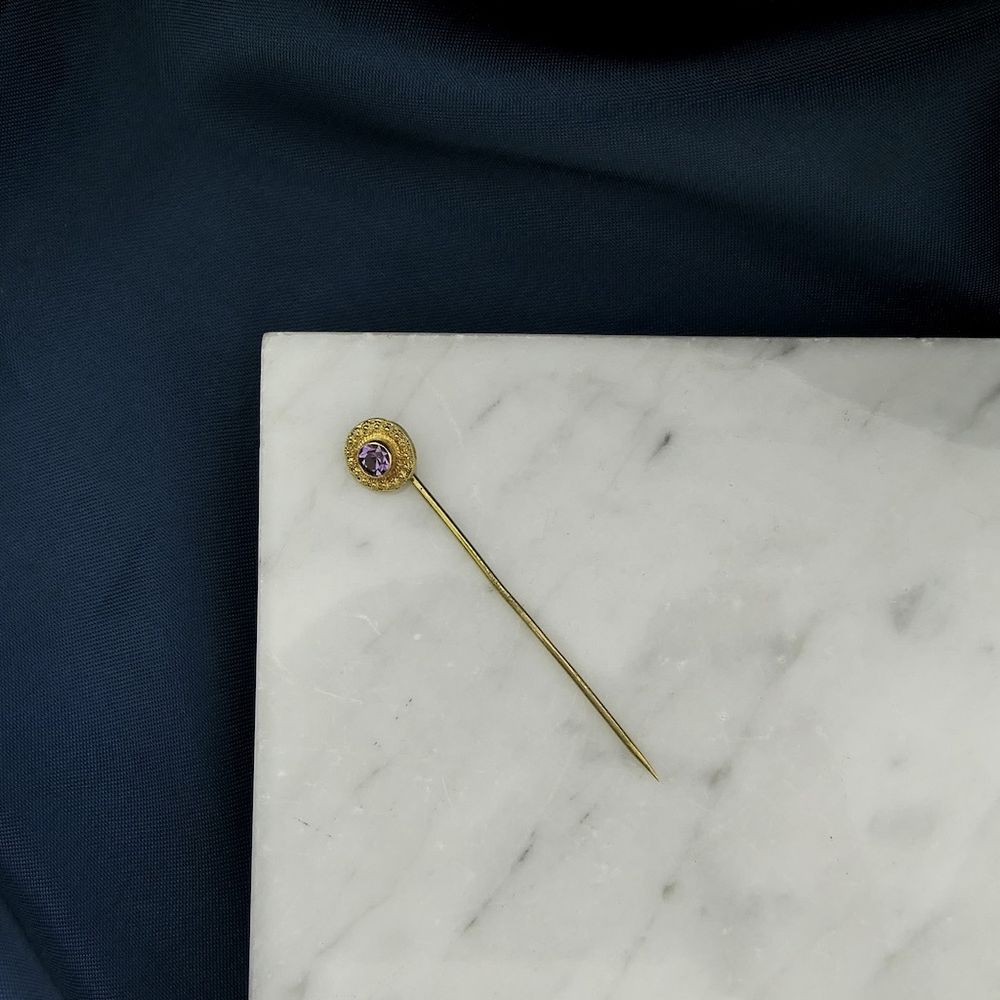 Gold lapel pin with purple zirconia. The pin is worn on the lapel of a jacket. It's a beautiful antique piece that can certainly be worn again today. The pin is made of 18-karat yellow gold (750/1000).